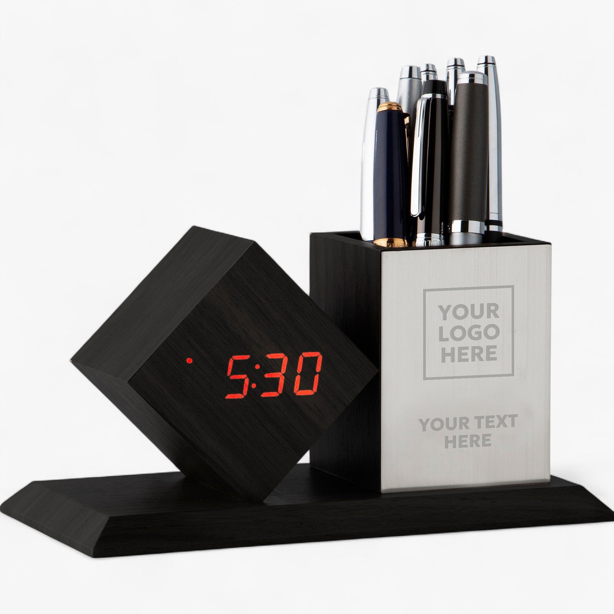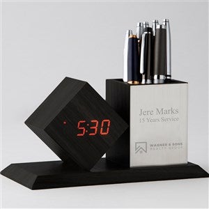 The Personalized Grey Digital Desk Clock and Organizer can be custom engraved using any name, logo, and/or text. Celebreate achievements in your office or simply decorate your workspace with this elegant clock and organizer.