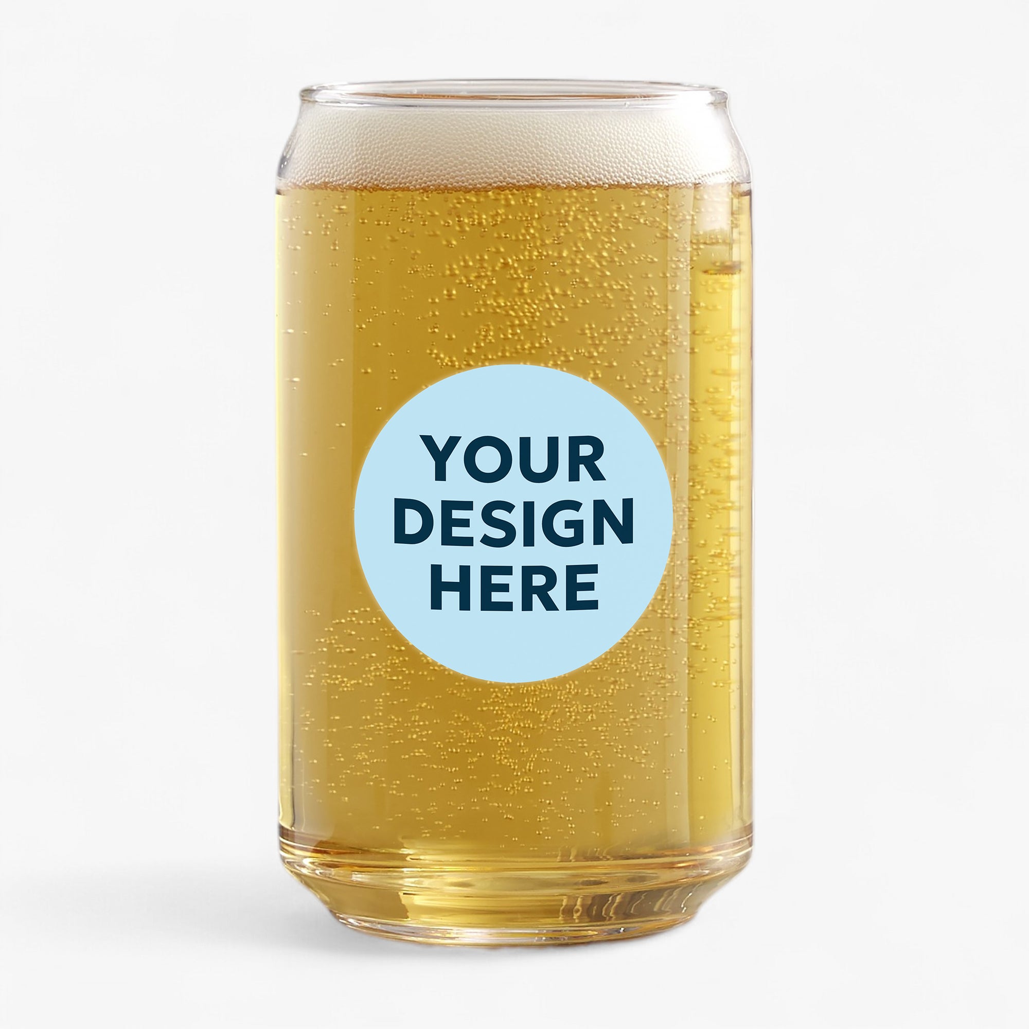 Customize the Personalized Logo Printed 16 oz. Beer Can Glass with any name, logo, and/or text. This glass can hold up to 16oz of any drink.