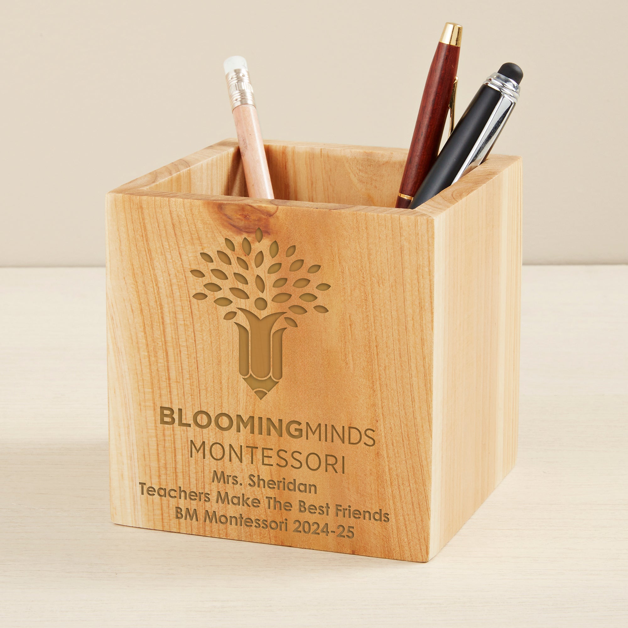 Decorate your office with the Engraved Logo Wooden Pencil Holder. This functional item also makes a good hiring or welcome to the team gift, and is engraved with any name, logo, and/or text.