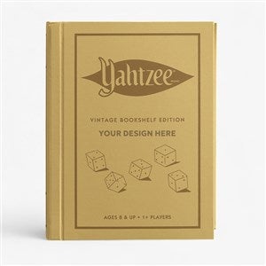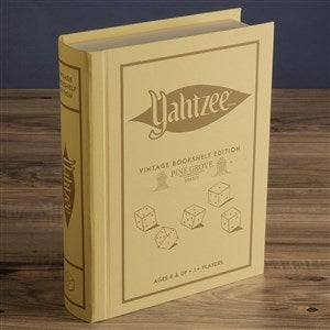 Family game night will be extra fun with the Yahtzee® Personalized Vintage Bookshelf Edition Board Game. Open the book and it will reveal premium components inspired by the original editions of the game, all stored neatly inside, and can be stored on your bookshelf when you're not playing. Personalize this item with your company or employee names on the front cover.