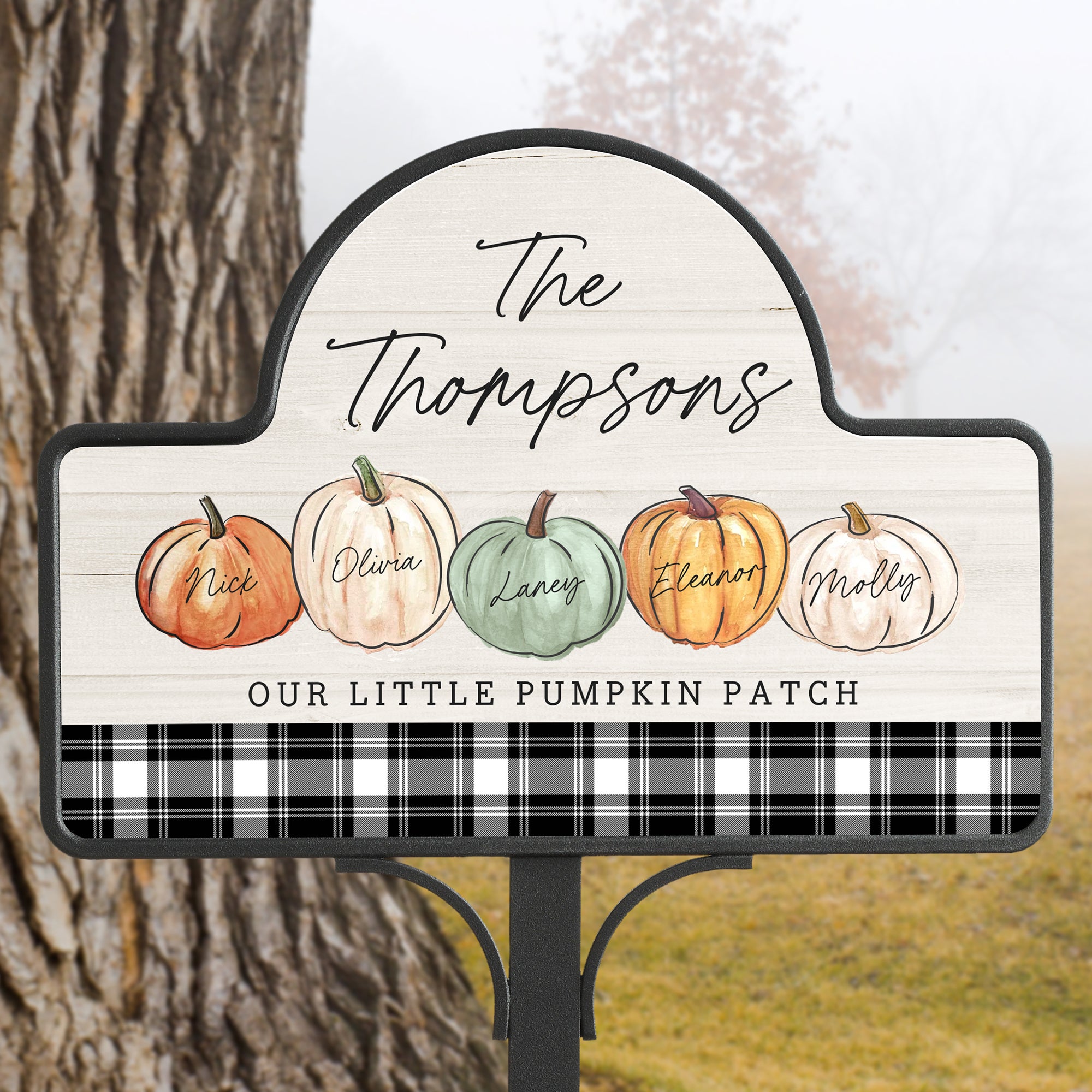 Add a touch of fall decor to your yard or walkway with the Fall Family Pumpkins Personalized Magnetic Garden Sign.