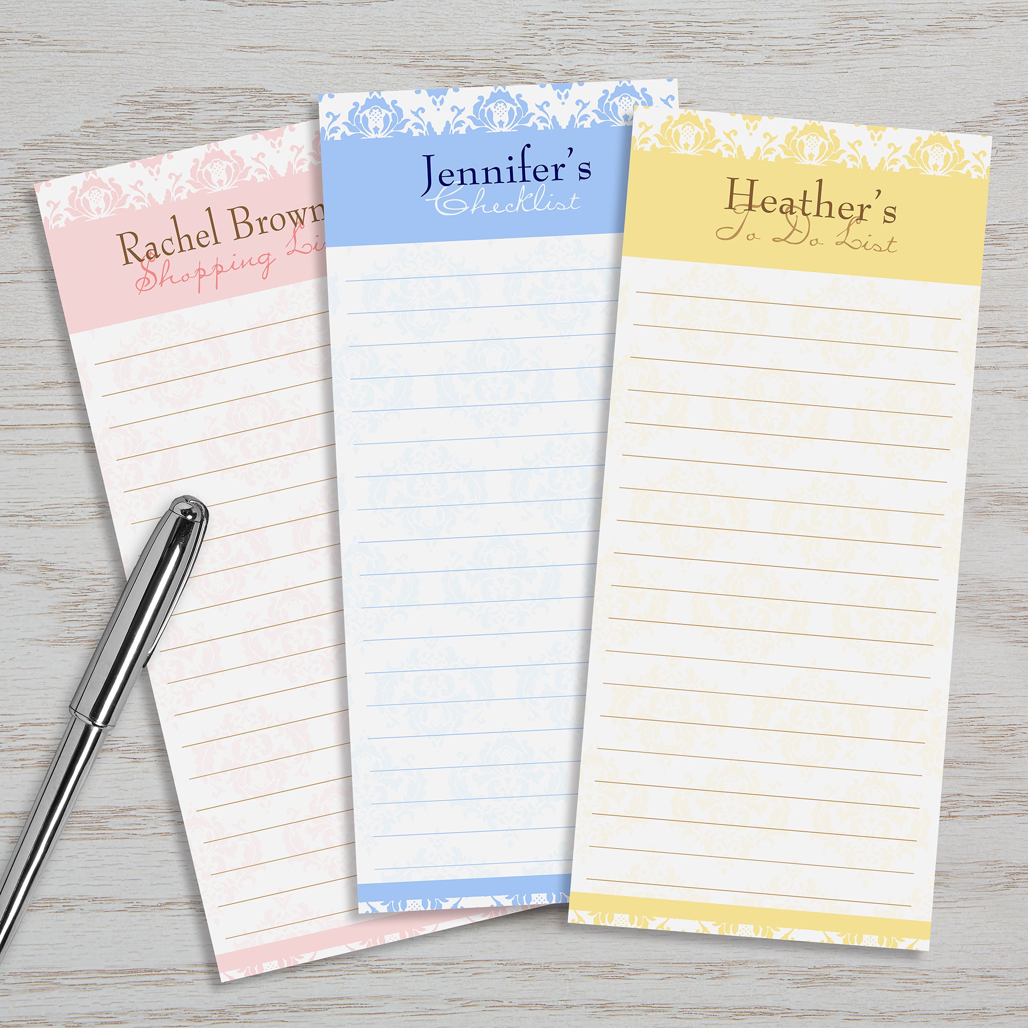 Stay organized with style when you personalize your own notepad set with any 2-lines of personalization you choose. Each notepad features a muted blue, pink, or yellow border of the classy damask pattern.