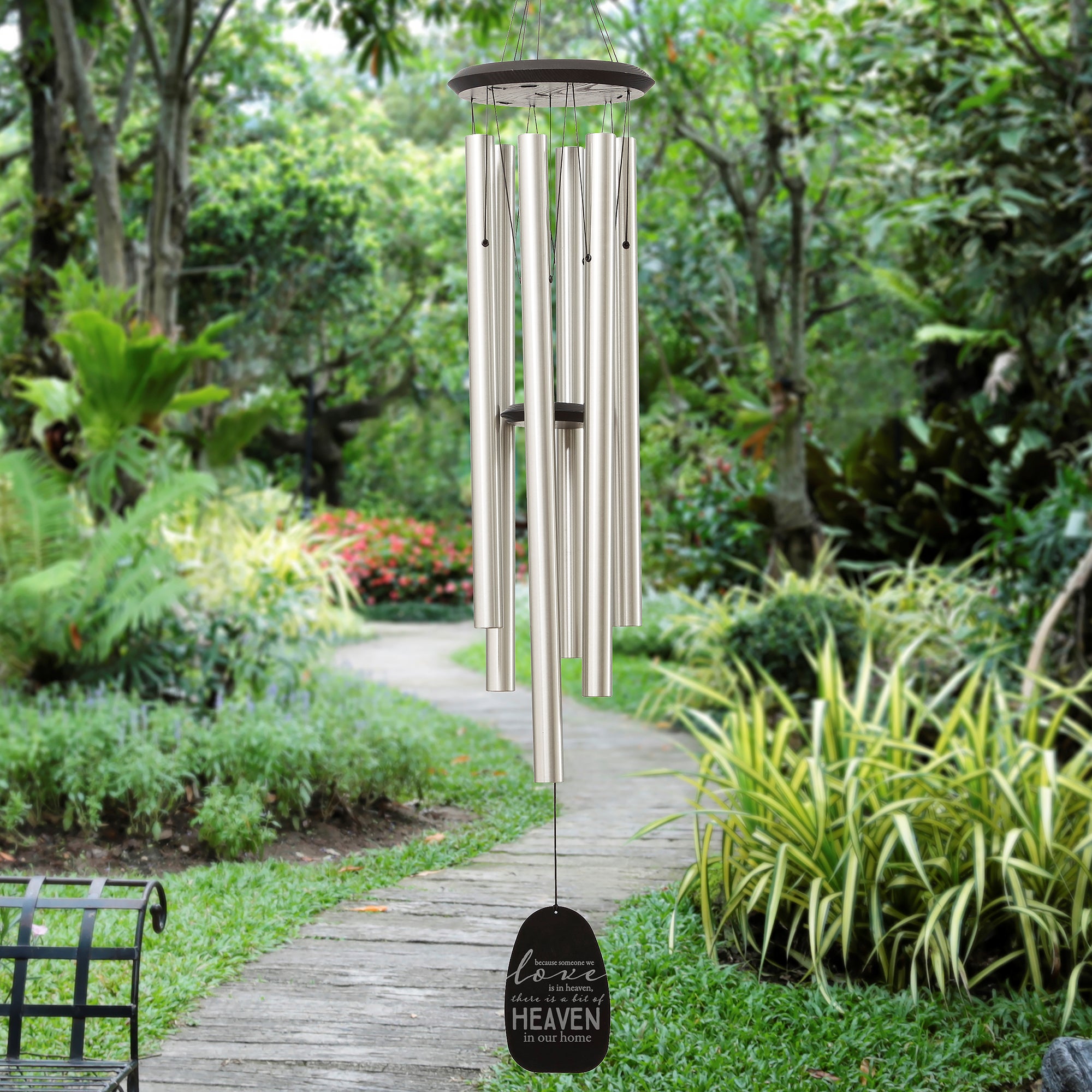 - Wind chime's hanging feather is custom engraved on the front with the "Heaven In Our Home" Phrase