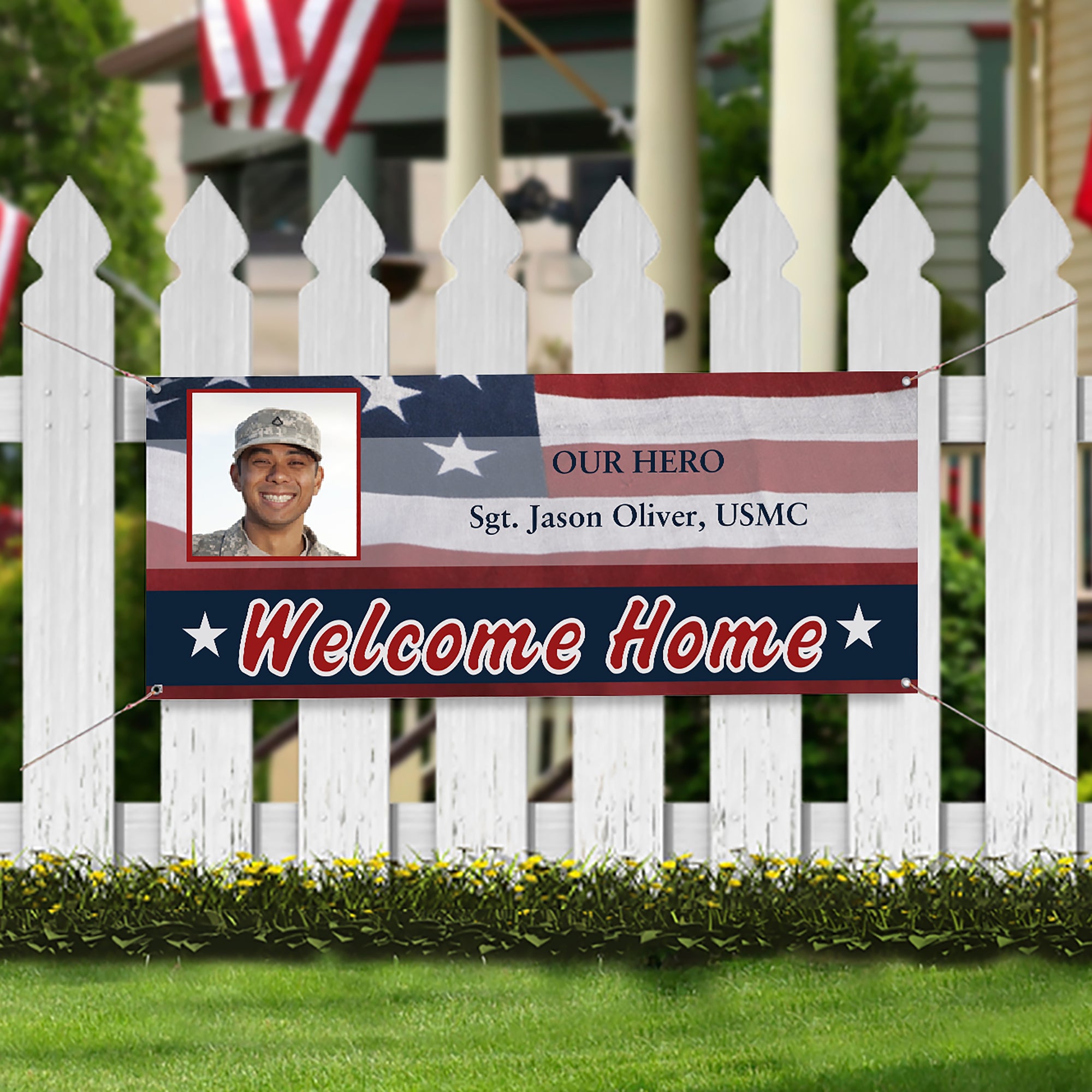 Announce their long awaited arrival with our Military Proud Personalized Photo Banner! This banner makes a special "Welcome Home" gift for your favorite military member.