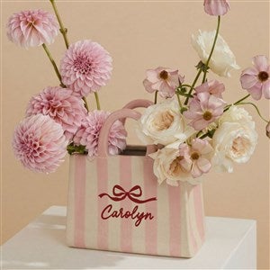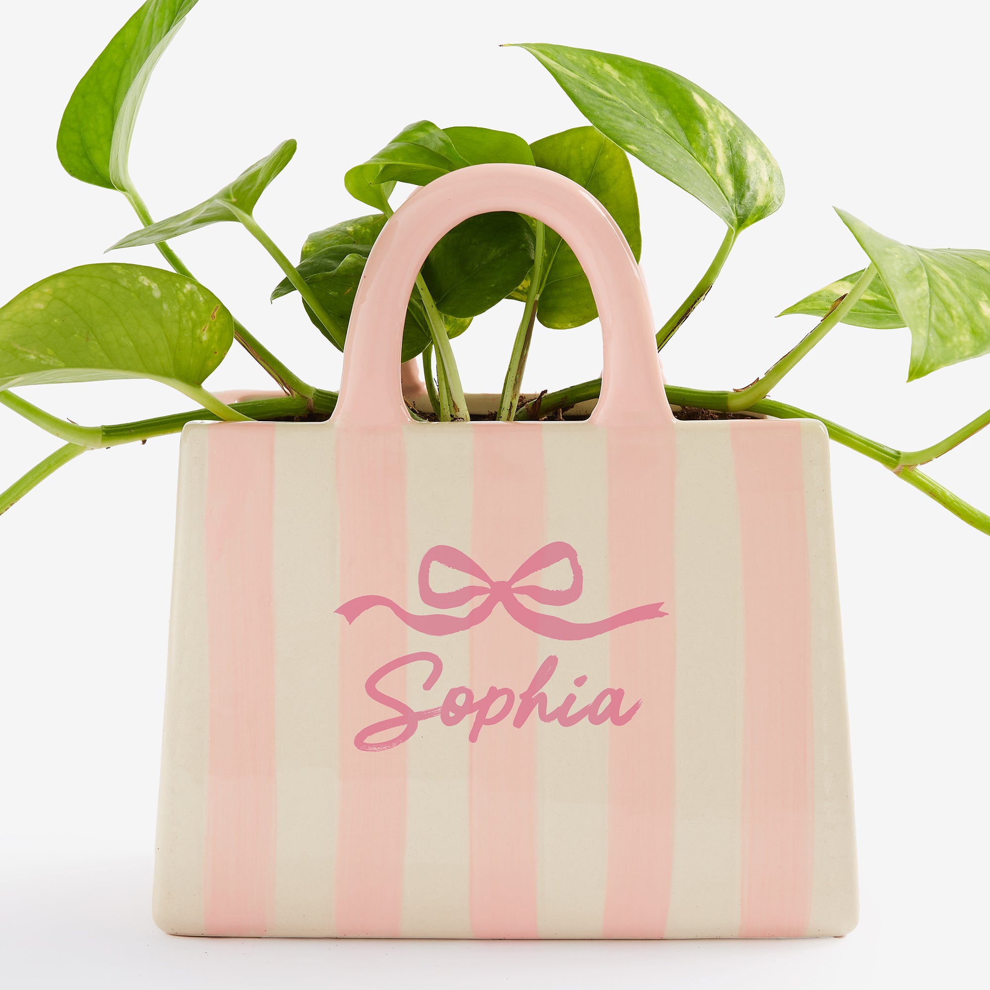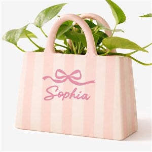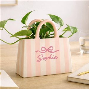 Add a touch of charm to any space with the Darling Bow Personalized Miranda Purse Planter. Designed in the shape of a classic mini tote and accented with soft stripes and a delicate bow, this piece blends playful style with thoughtful personalization.