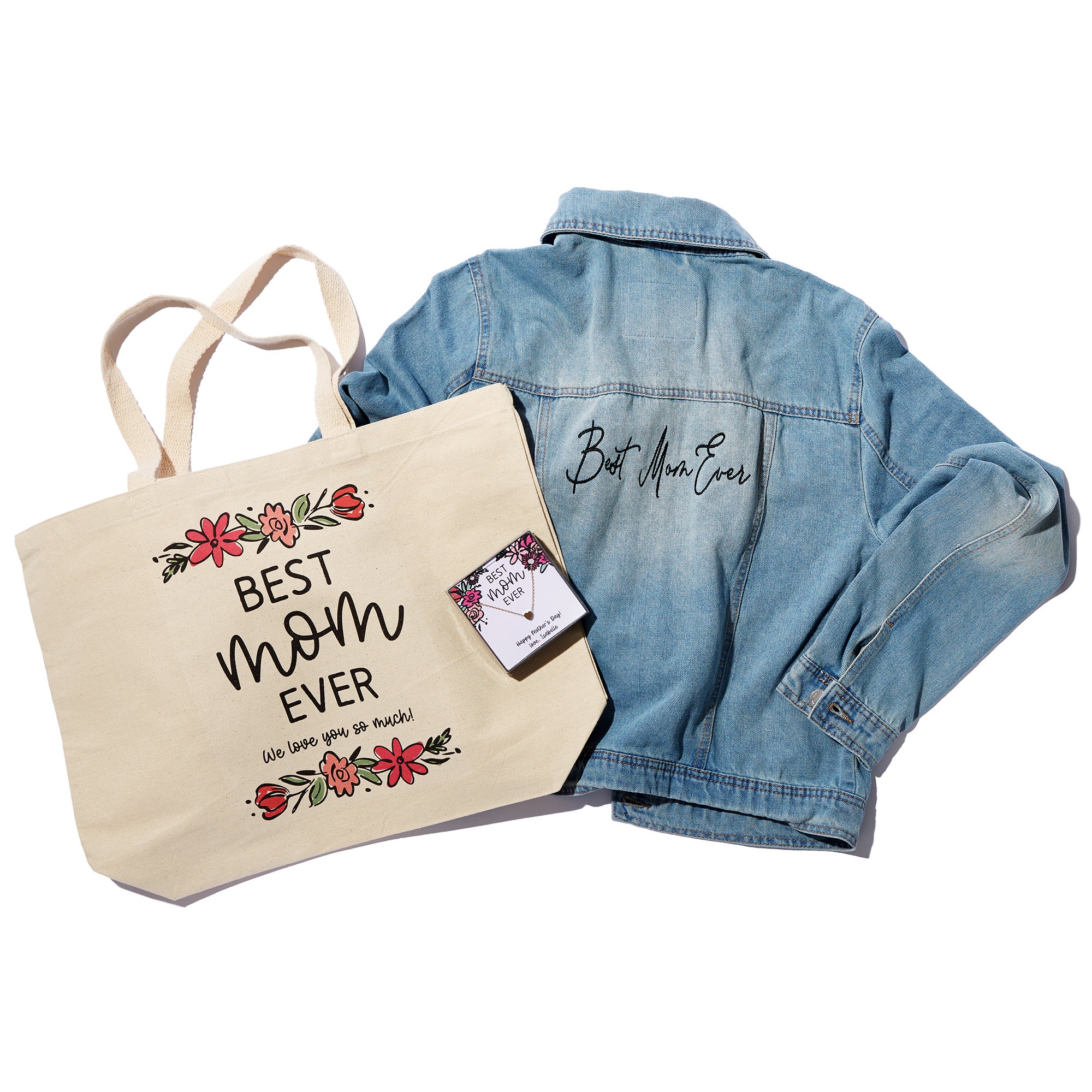 Celebrate her style and heart with a gift set as bold and beautiful as she is. Featuring a chic denim jacket, a gold heart necklace, and a matching canvas tote adorned with floral details and a sweet message, this duo is perfect for moms who do it all and look good doing it. Thoughtful, fun, and functional - this is the ultimate gift to show your appreciation.