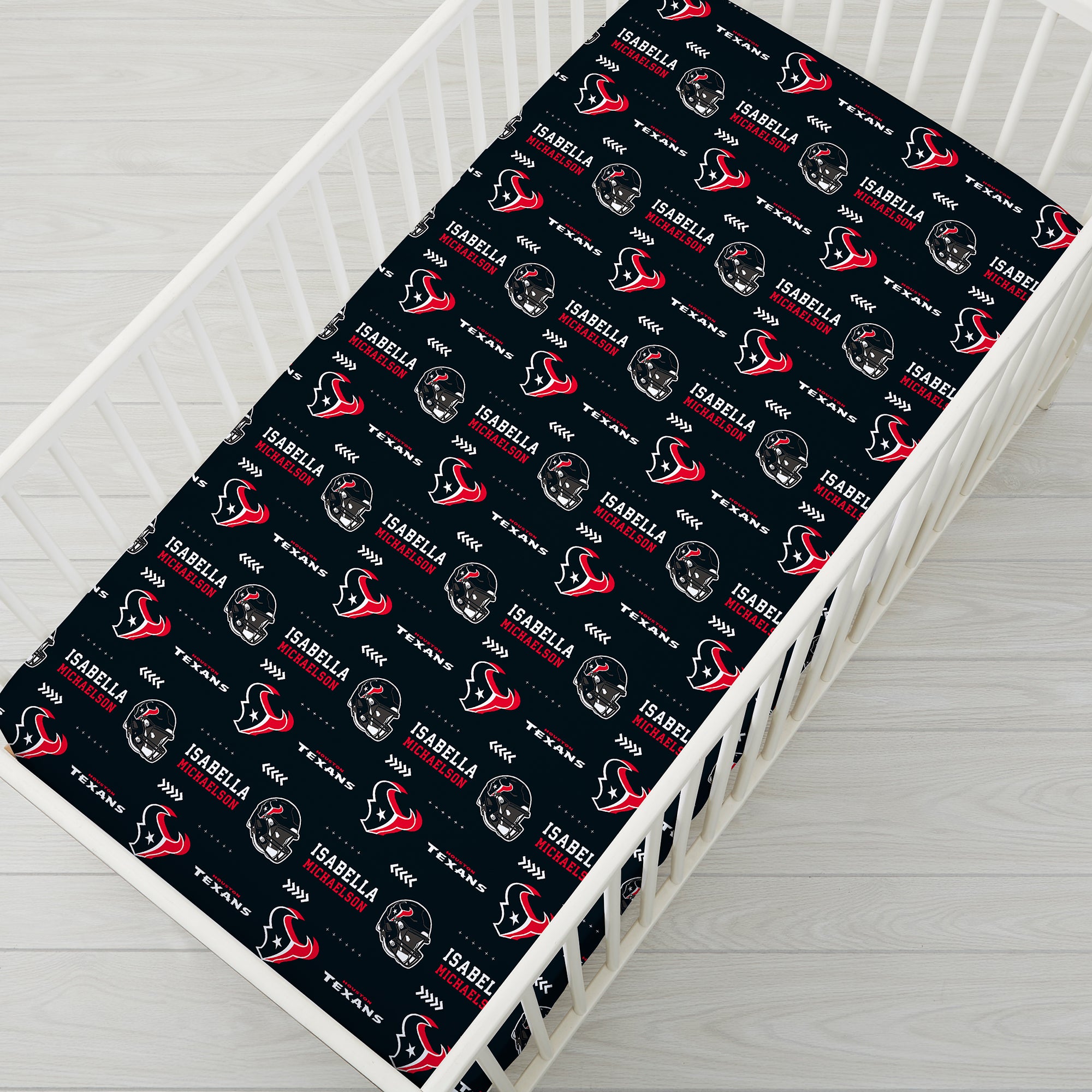 The NFL Houston Texans Personalized Crib Sheet adds baby's name to your favorite team logo and makes a truly personal nursery design. This crib sheet makes a great gift for a newborn baby boy or girl!