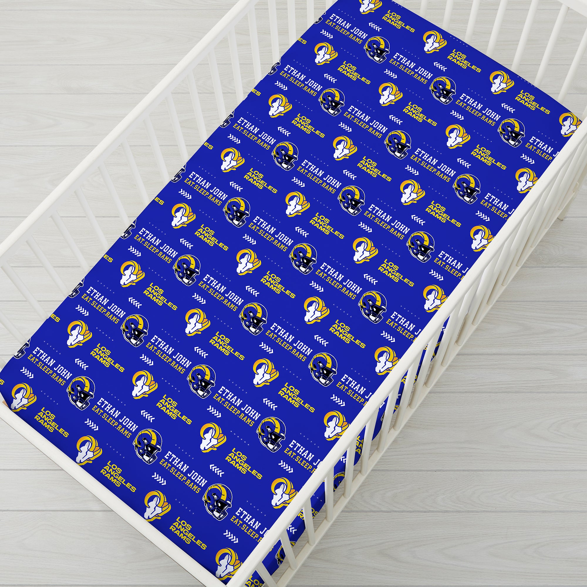 The NFL Los Angeles Rams Personalized Crib Sheet adds baby's name to your favorite team logo and makes a truly personal nursery design. This crib sheet makes a great gift for a newborn baby boy or girl!