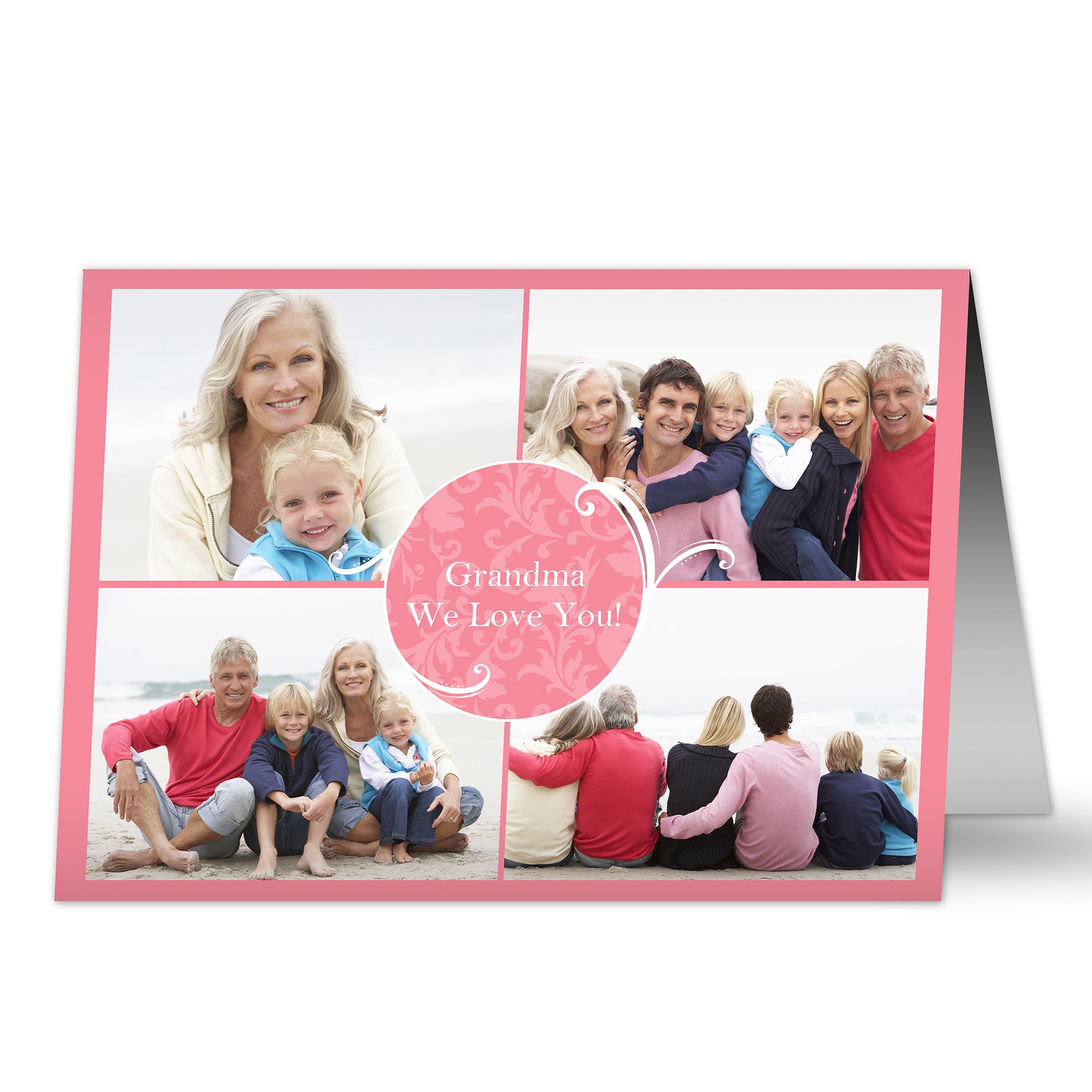 Upload any 4 photos to be printed across the front of the card, with any 2-line personalization in center for a very personal touch.
