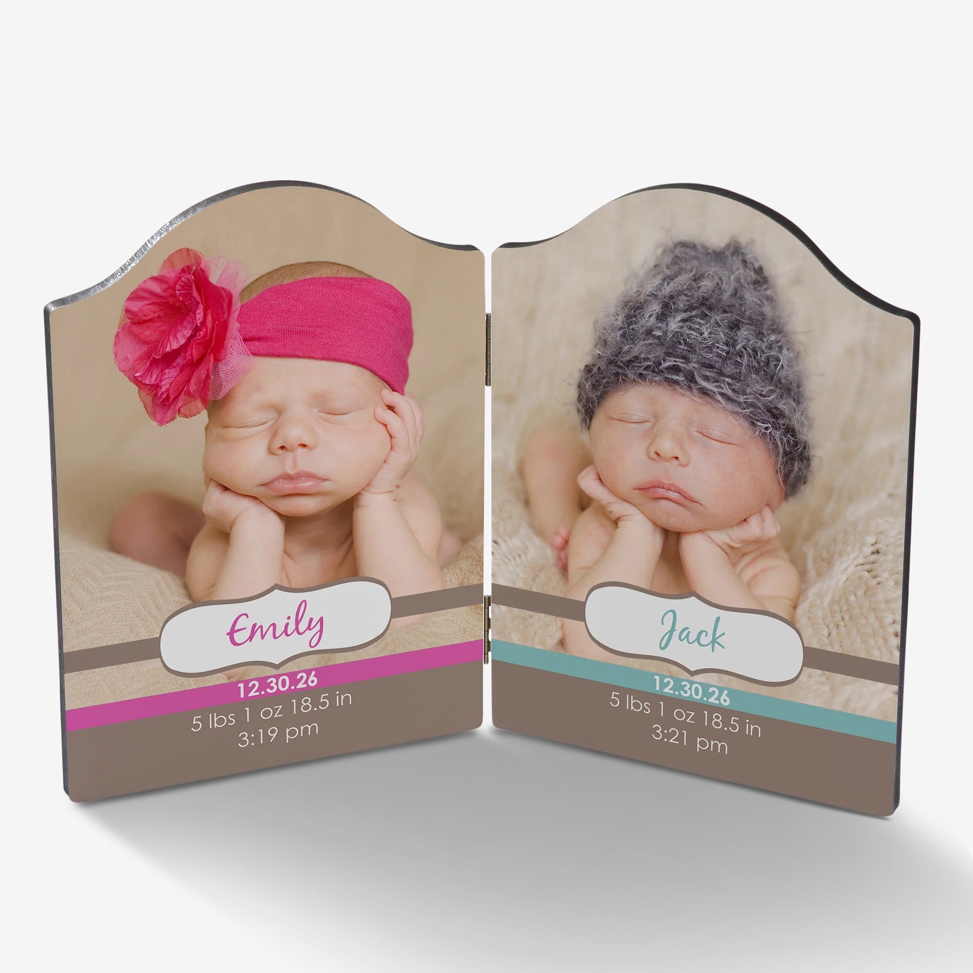 - Personalized with the twins' names and optional birth information displayed below any photo