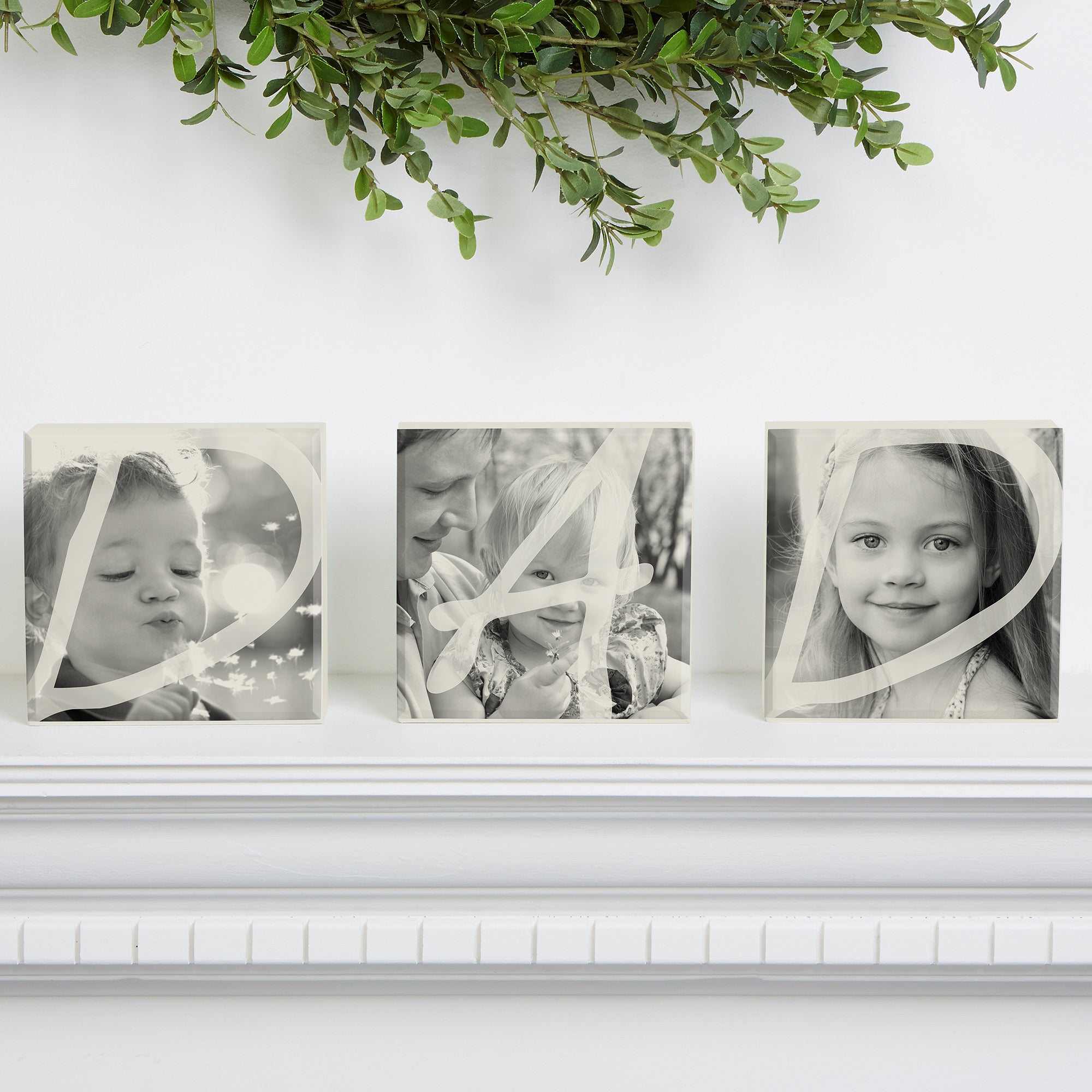 The perfect home decor piece to celebrate that special man in your life is our DAD Personalized Photo Shelf Blocks. This set of 3 blocks features the word DAD is printed in semi-transparent letters across the front of the photos.
