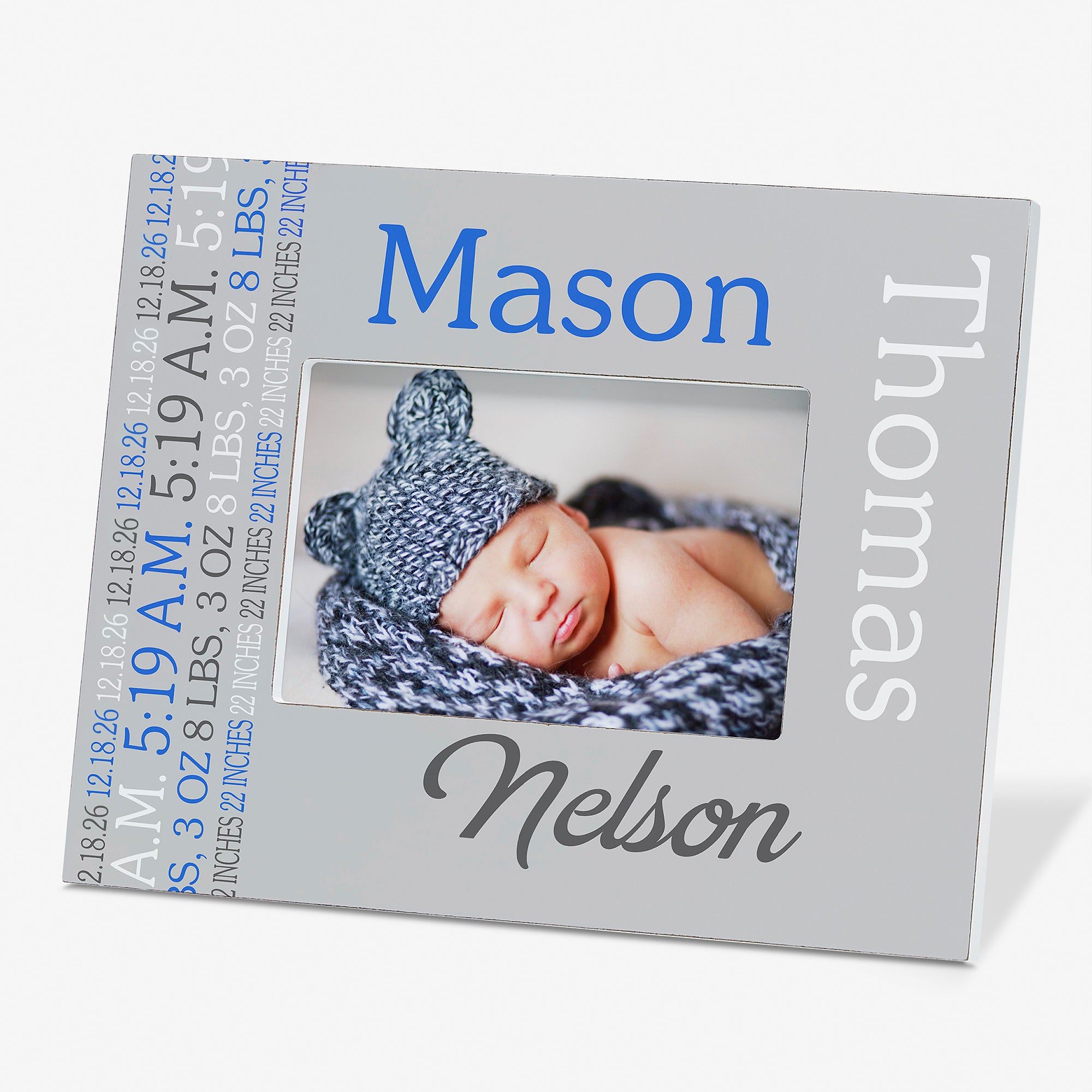 - Baby's birth information will be printed along the left side in a repeating design, then his name will be featured on the front