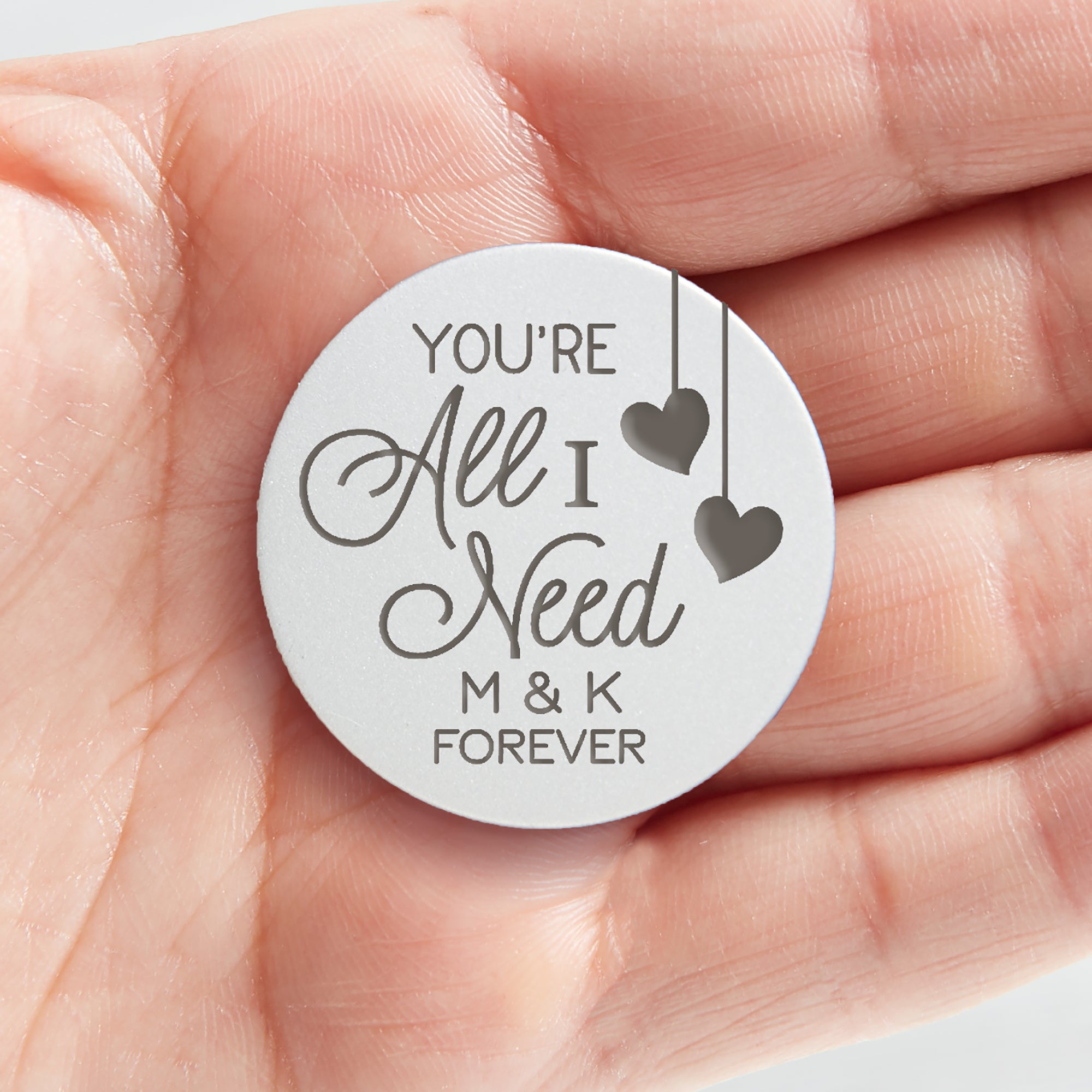 - Engraved with any 2 names or initials and 1 line of text under the "You're All I Need" design
