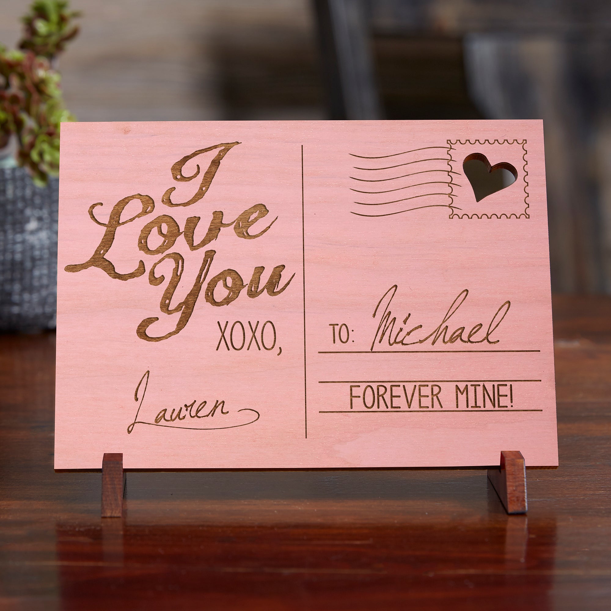 Send a special delivery with your message of love in a most unique way with our Sending Love Personalized Wood Postcard.
