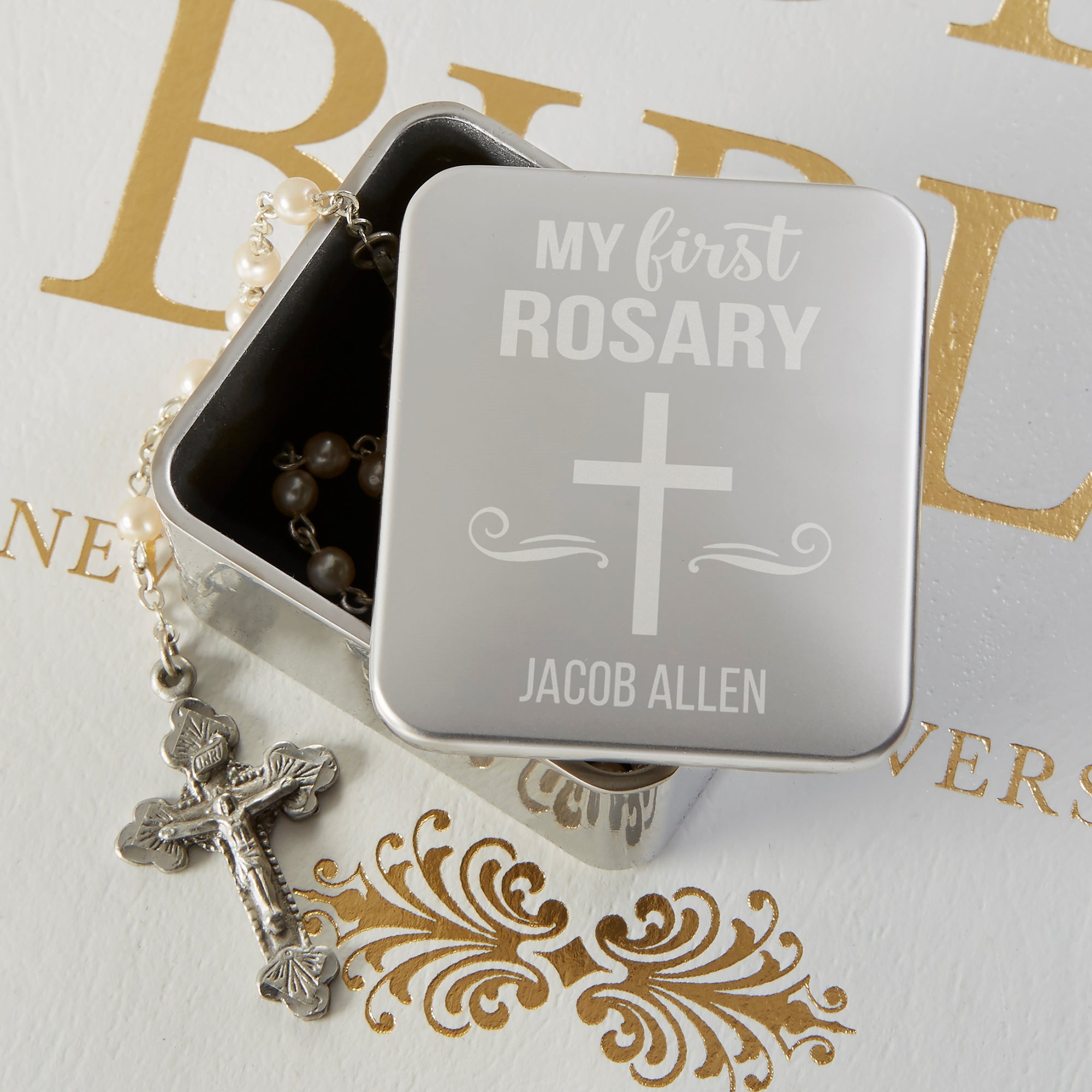 Certain to be treasured forever, our My First Rosary Personalized Keepsake Box creates a special place to store their first rosary. It makes the perfect personalized gift for a baby's Baptism or a child's First Holy Communion.