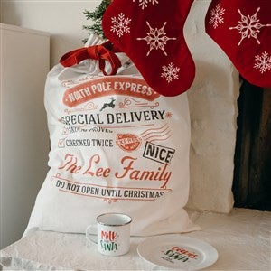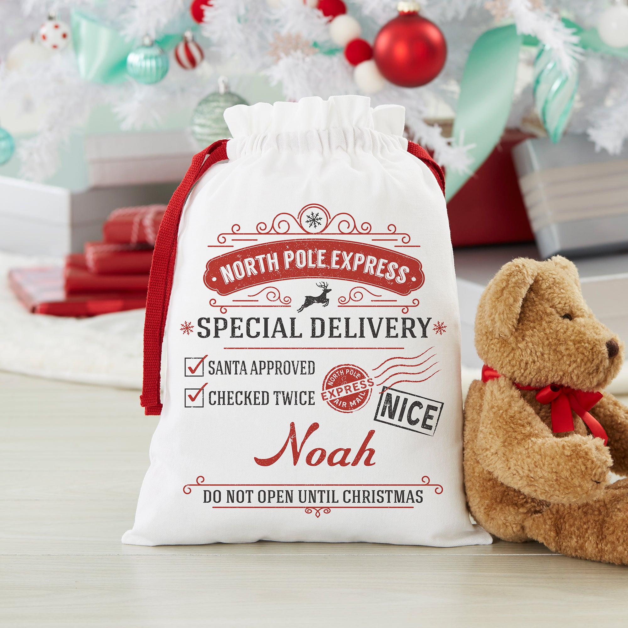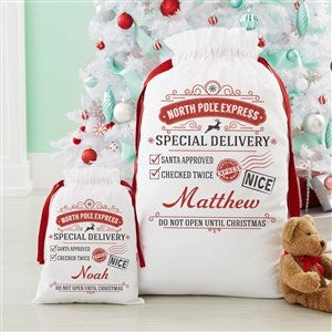 Your child's face will light up with joy when our Special Delivery From Santa Personalized Canvas Drawstring Santa Sack is filled with toys just for them! Santa approved; this will be a Christmas gift that anyone will enjoy!