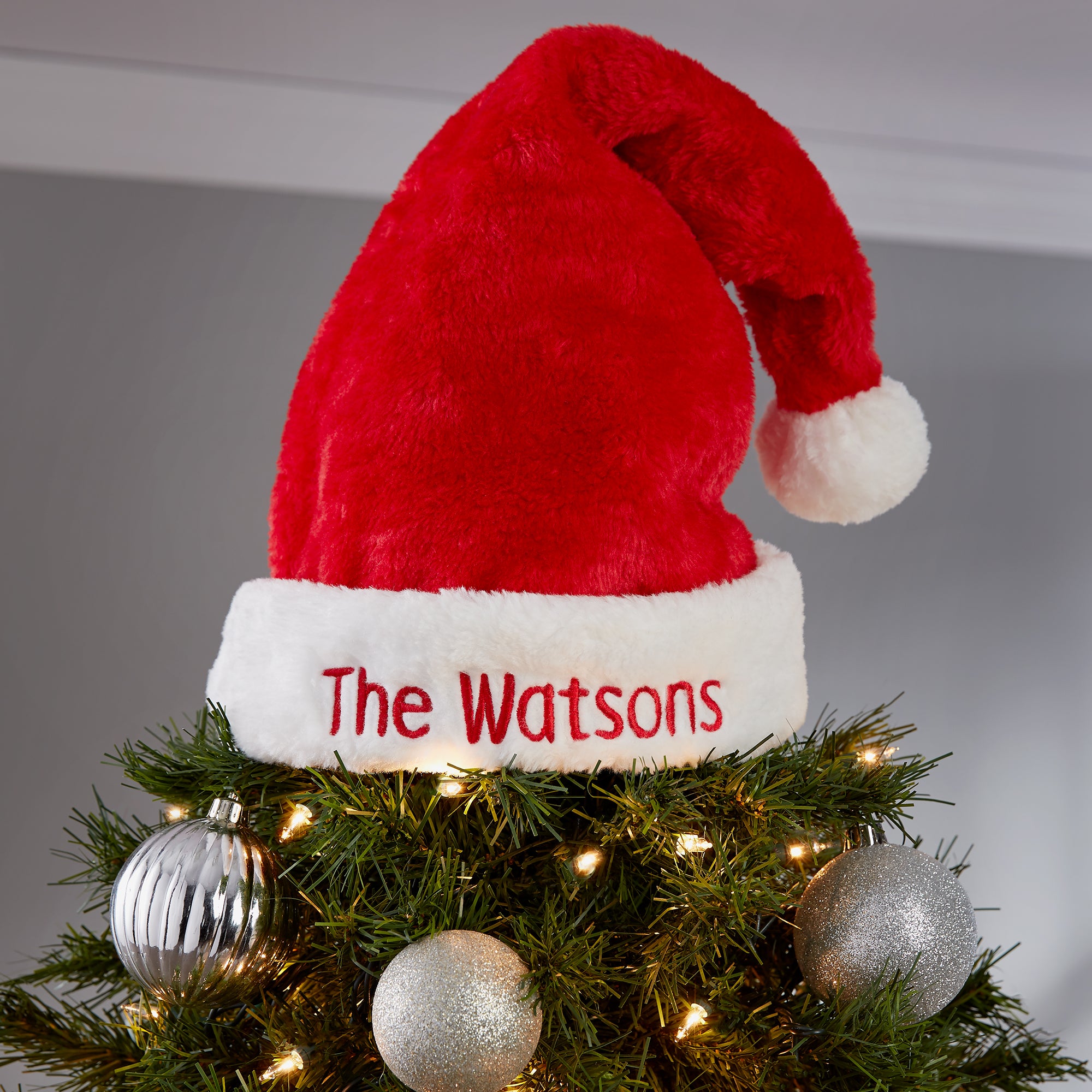 Have the perfect tree topper this year with our Plush Velvet Personalized Santa Hat Tree Topper sitting atop a beautiful decorated Christmas tree.
