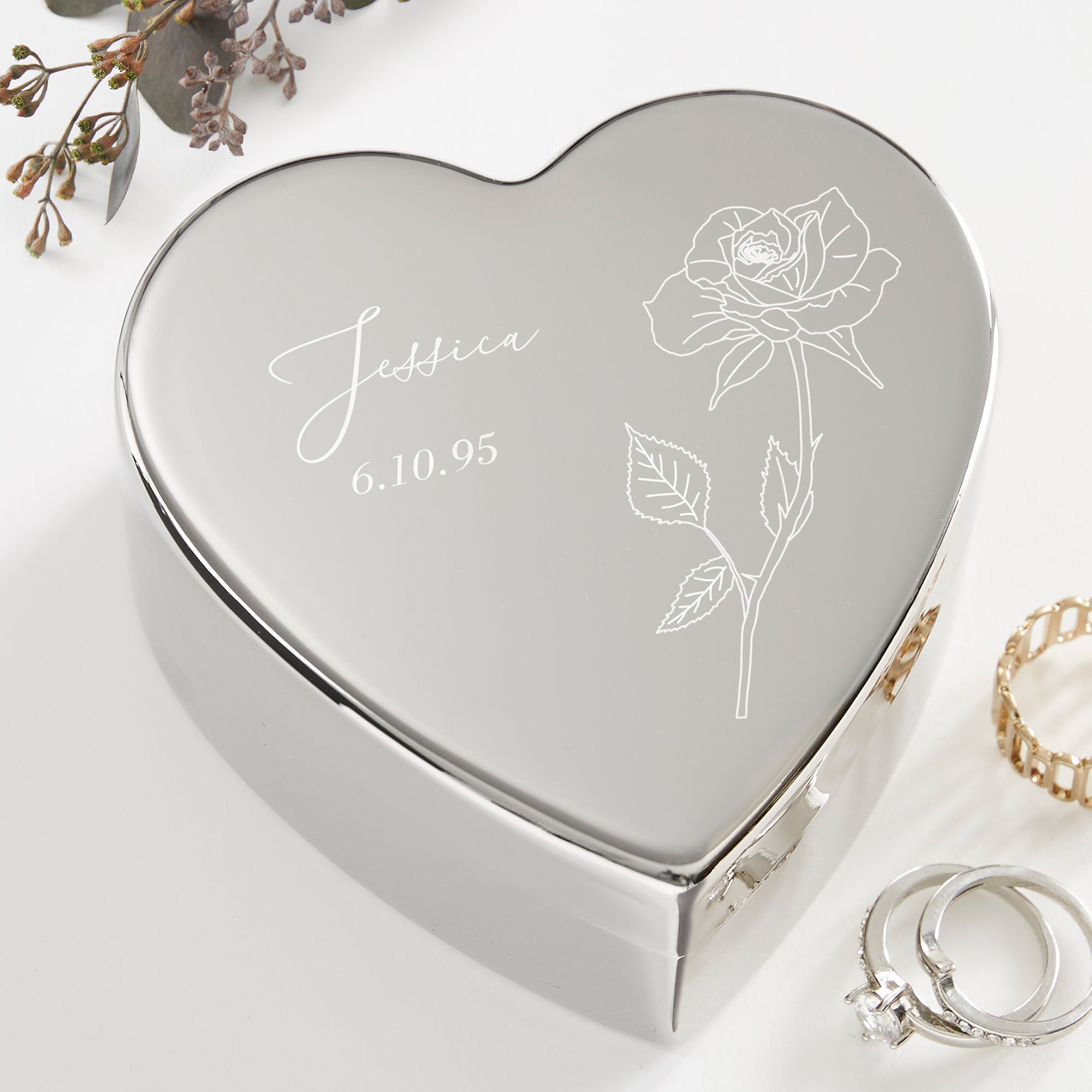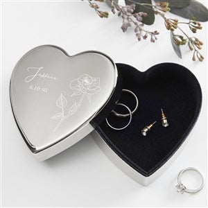 Create a lovely and memorable gift for her with our Birth Month Flower Personalized Silver Heart Keepsake, a perfect place to store earrings, necklaces, rings and more.