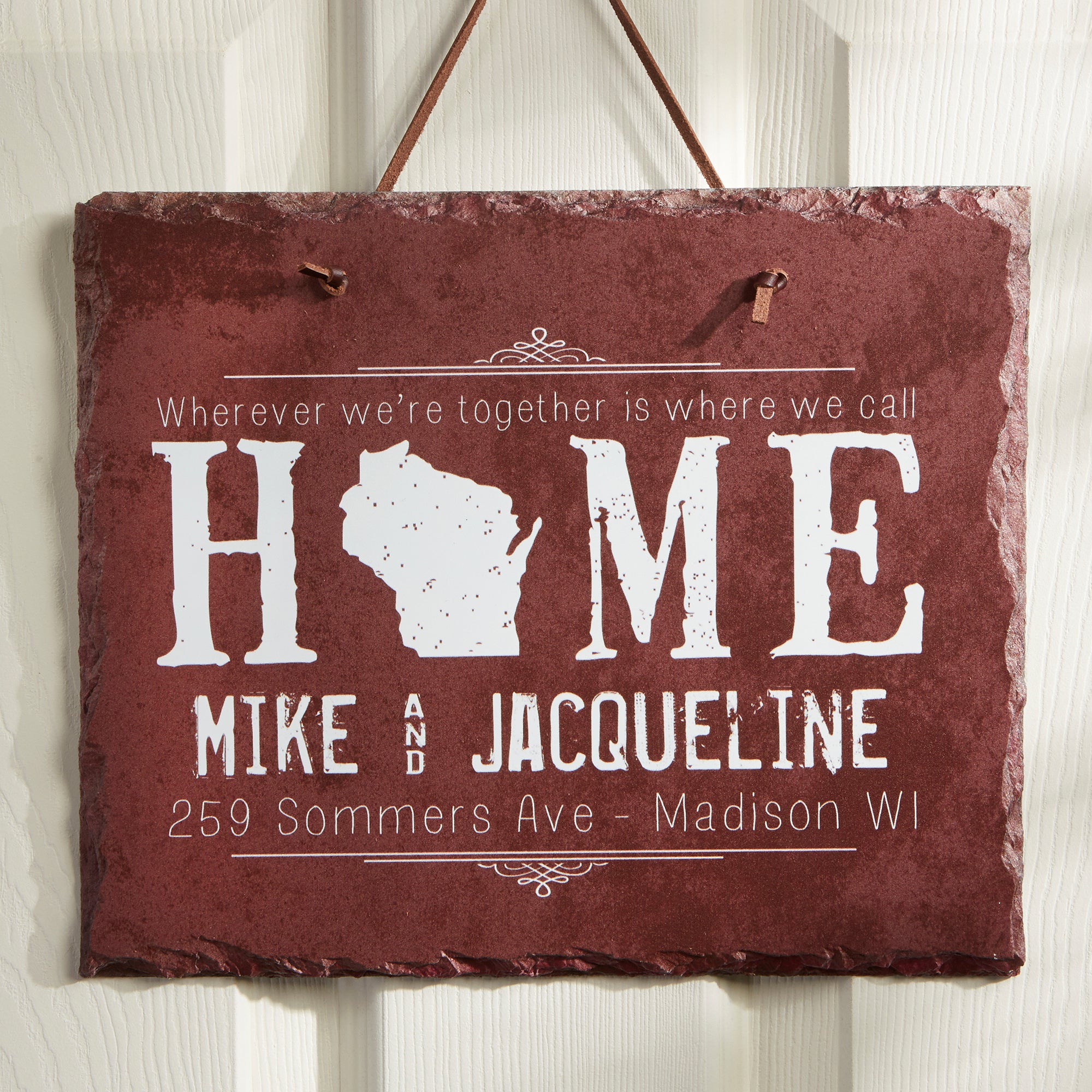 We will incorporate your home state to spell out "HOME", then any title and 2 lines of personalization including names, established year, city, state, address or any details you choose.