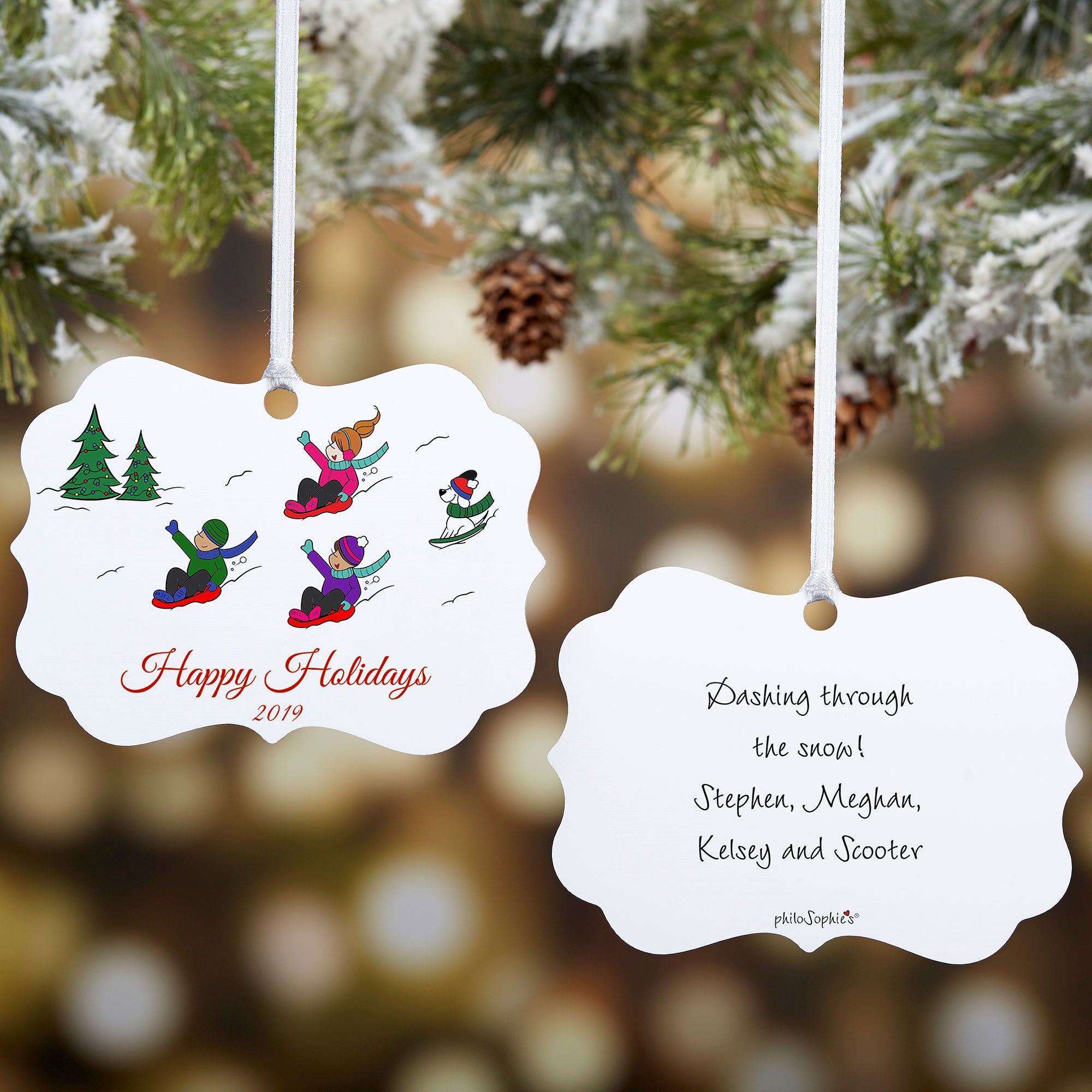 Our exclusive philoSophie's® Sledding Family Personalized Metal Ornament makes a unique gift for any family who loves to make the best of their snow days. Add a flare of personalized style to any Christmas tree or ornament stand this holiday season!