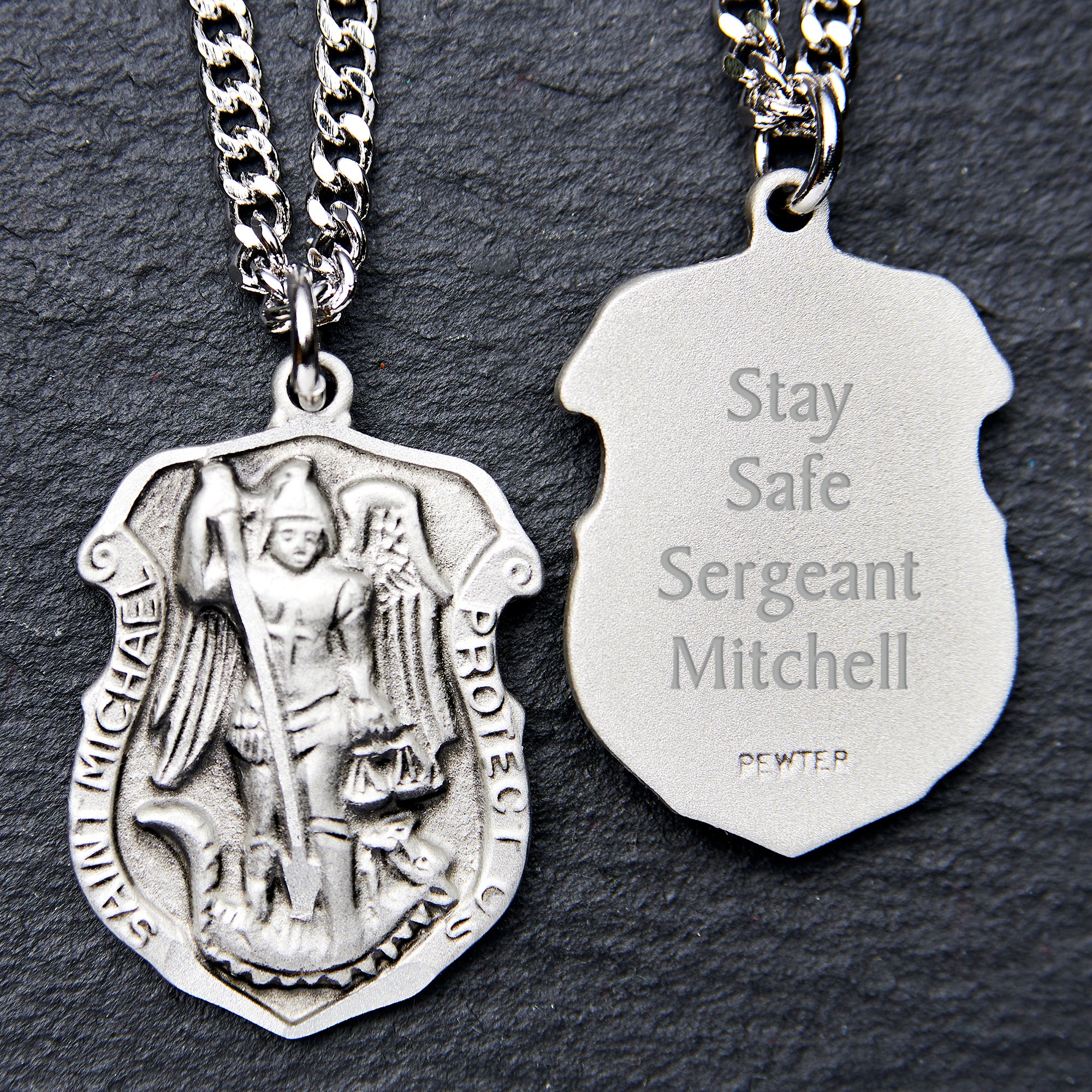 Send him blessings of love and safety with our handsome St. Michael Law Enforcement Personalized Pendant.