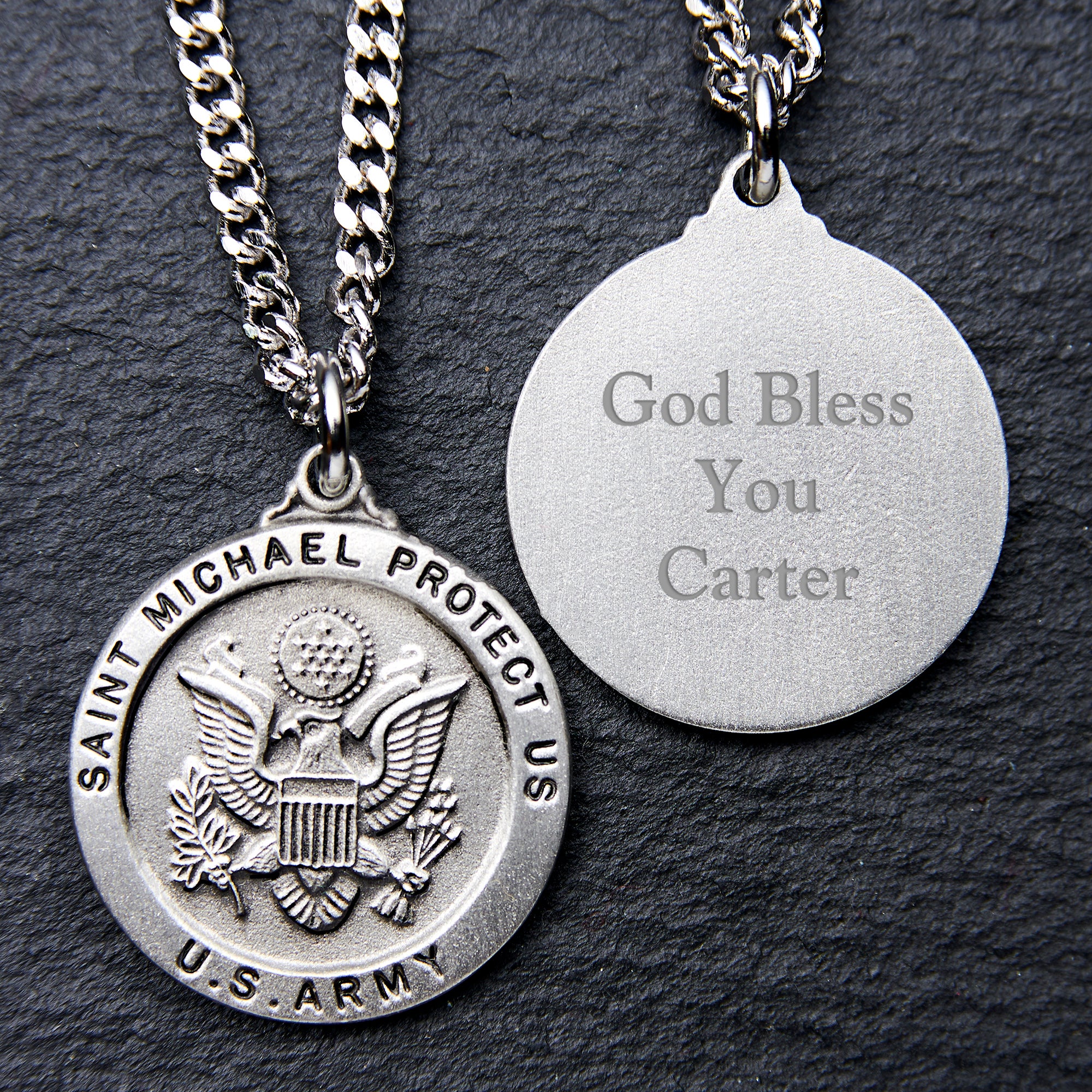 - Front side features carved, detailed artwork of the U.S. Army logo surrounded by the phrase "Saint Michael Protect Us"
