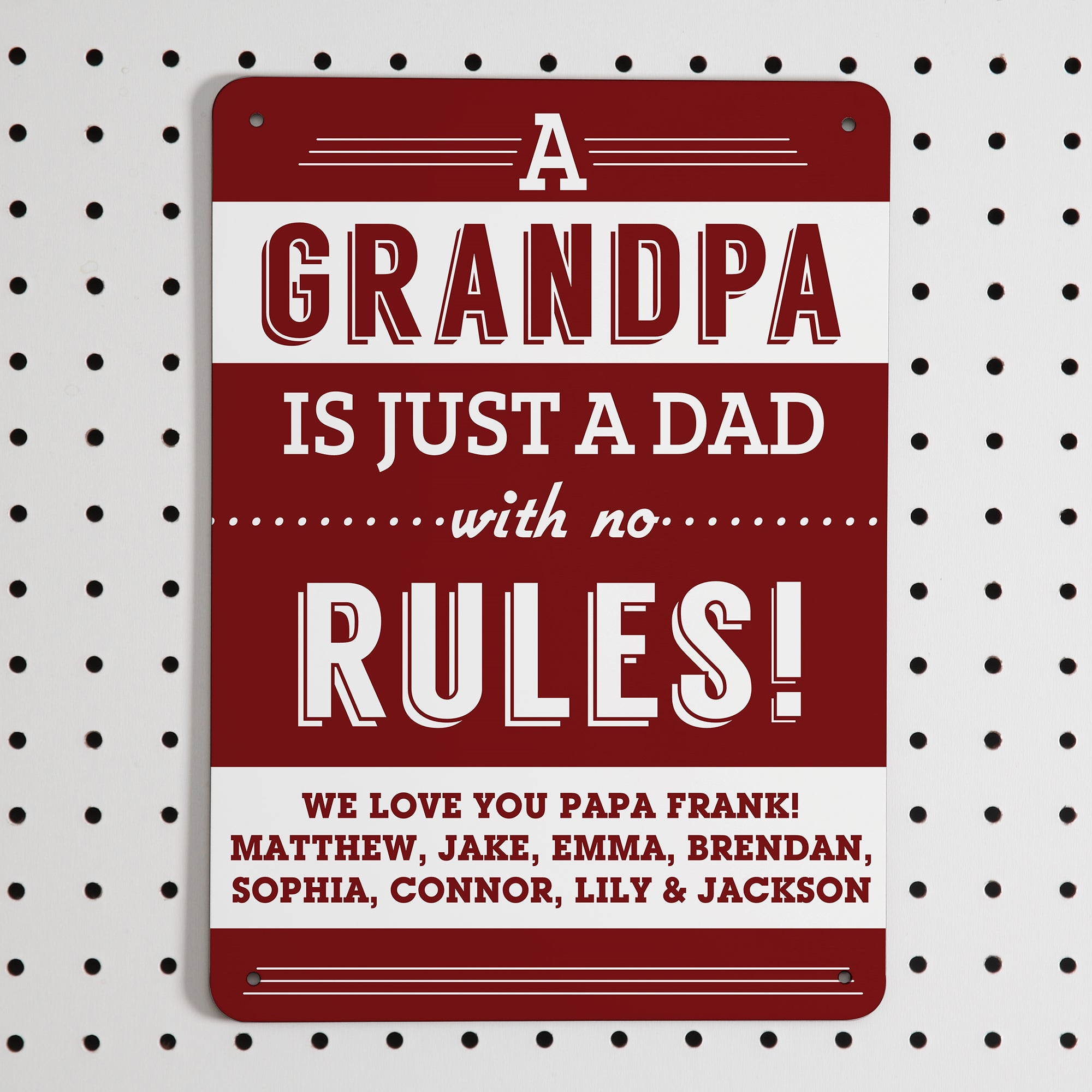 Choose from 3 color options to highlight the quote; A Grandpa is just a dad with no RULES! Then add your own message for grandpa with 3-lines of text underneath. Grandpa can hang this sign in his basement, workshop, or garage!