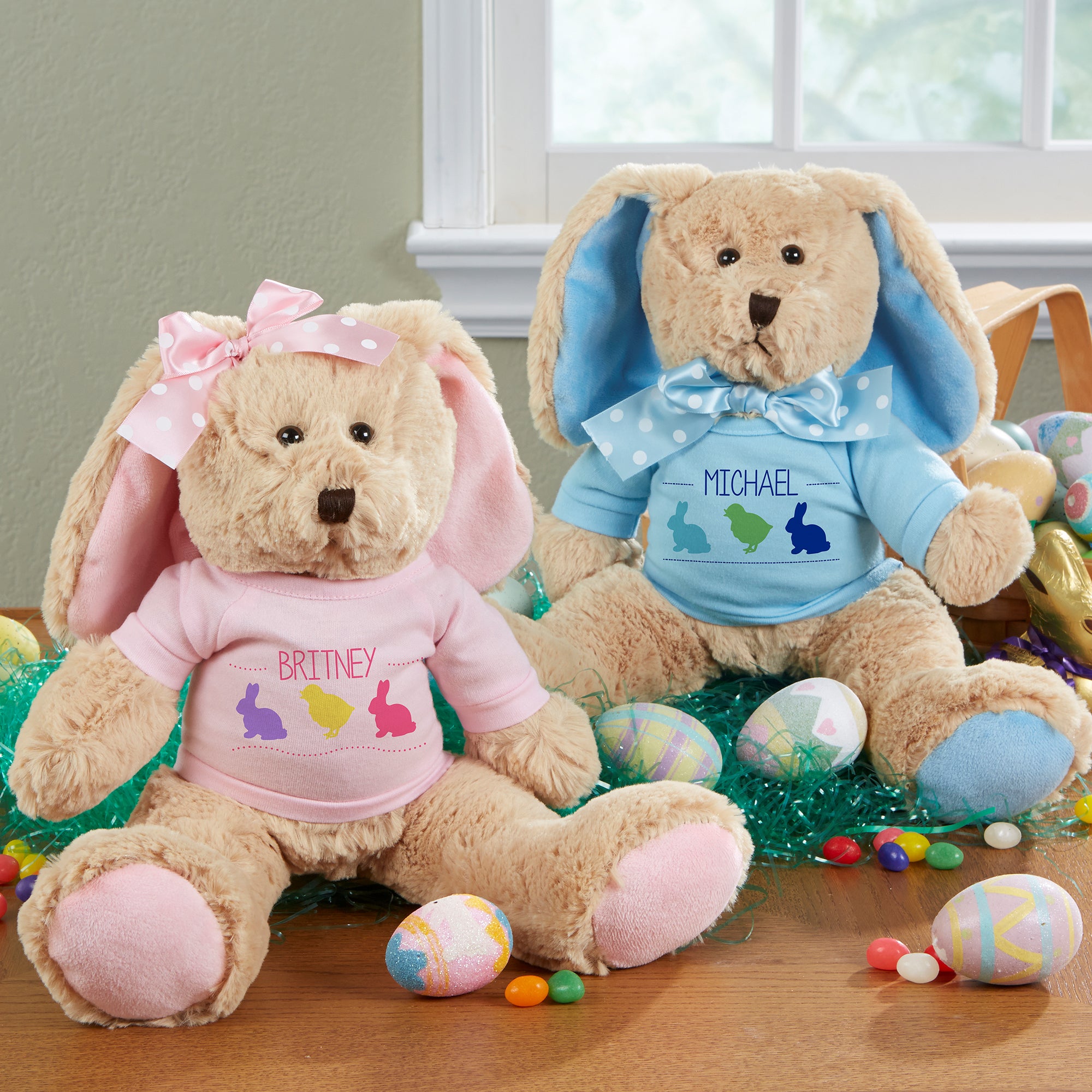 Our adorable patterned bunny and chick design is perfect on our Hop Hop Personalized Plush Bunny. Measuring over a foot tall from ears to toes, our plush tan bunny is decked out for Spring with a polka dot, satin bow and a soft blue or pastel pink t-shirt!