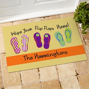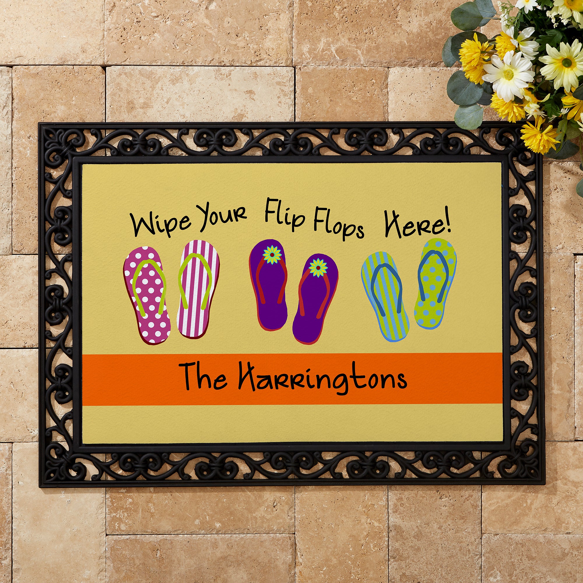 Welcome family and friends to your backyard pool, summer beach house, or vacation house with our exclusive Wipe Your Flip Flops Here Personalized Doormat!