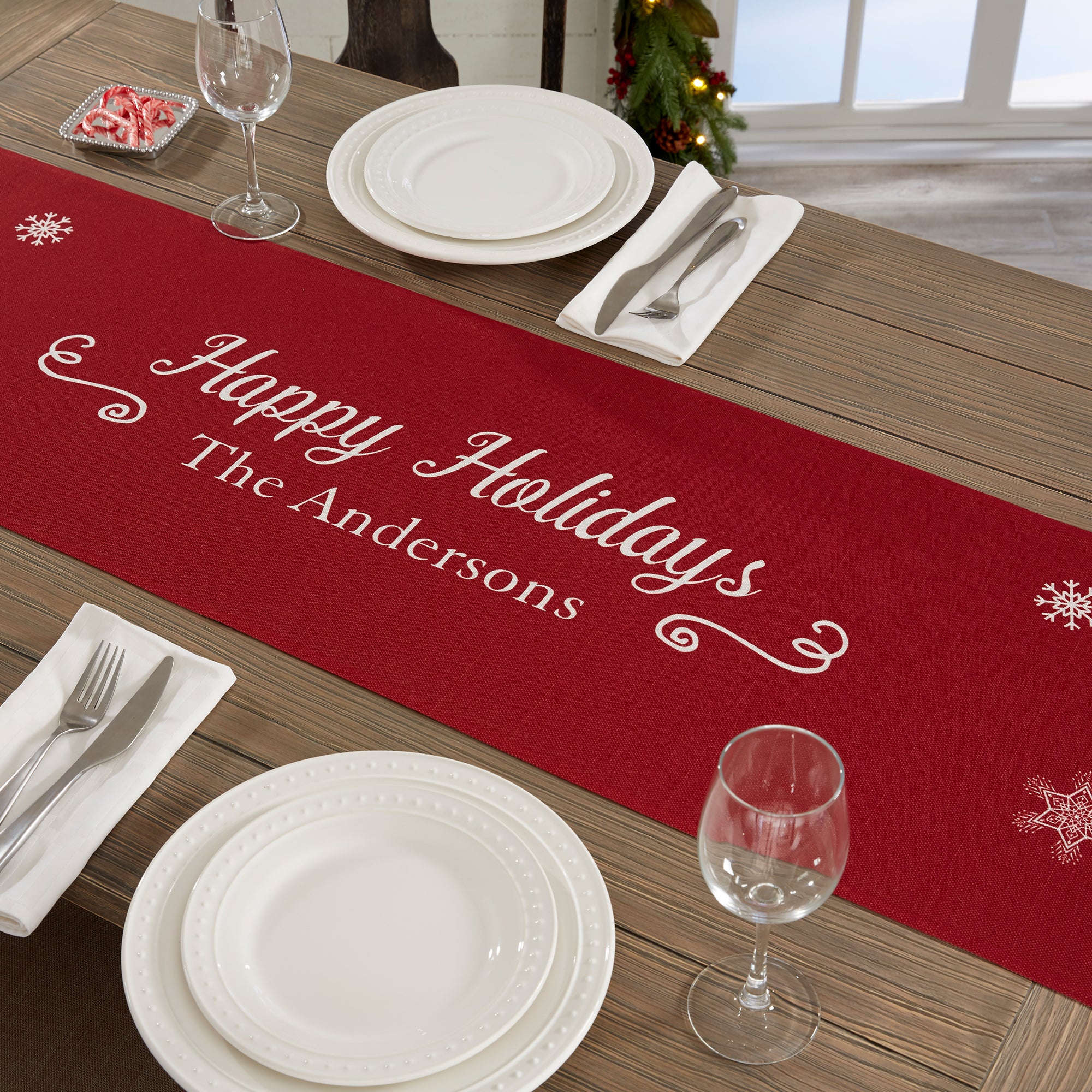 - Personalize with 2 lines of text in the center of the runner to include a holiday greeting and family name