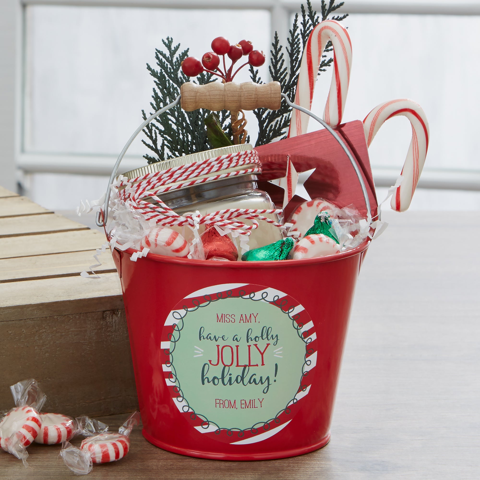 Fill these festive Holly Jolly Personalized Metal Teacher Gift Buckets with all their favorite candy and treats!