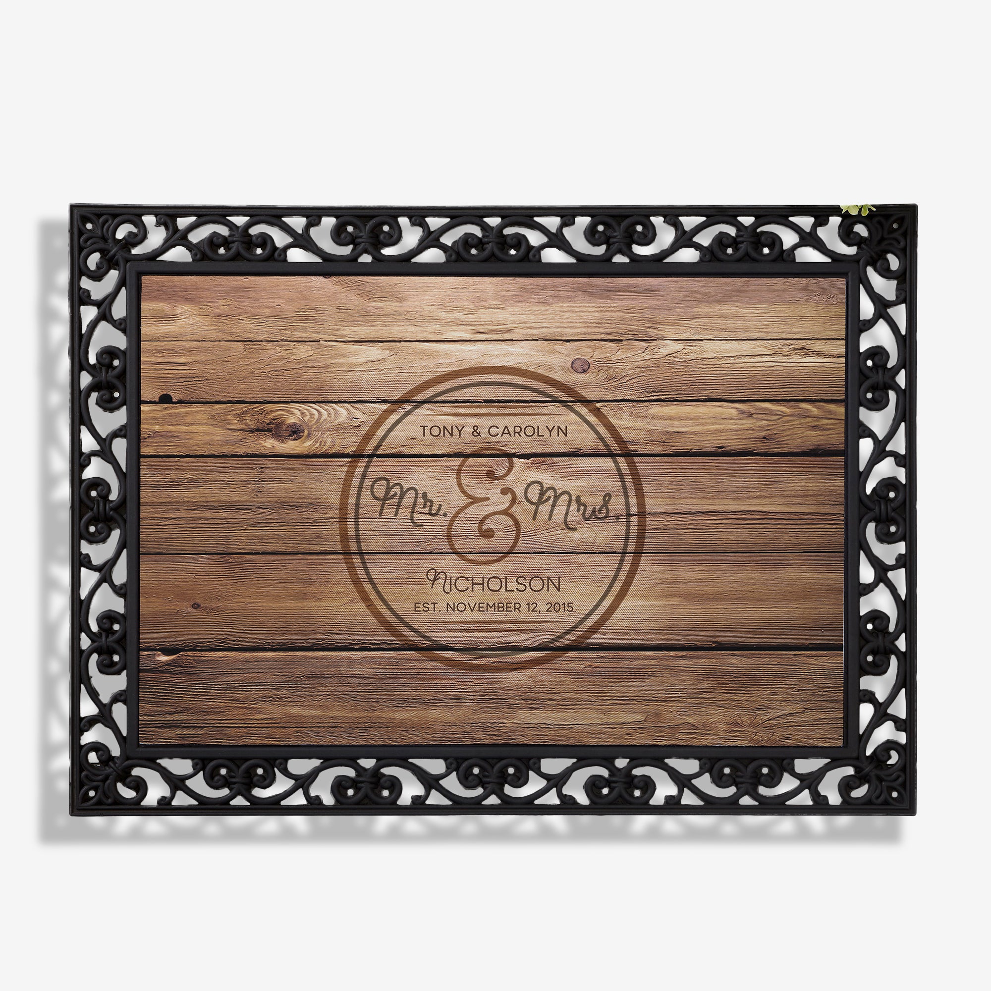 • Personalize with one of 3 couple titles within the center circle along with the wedded pair's first names, last name and the wedding date