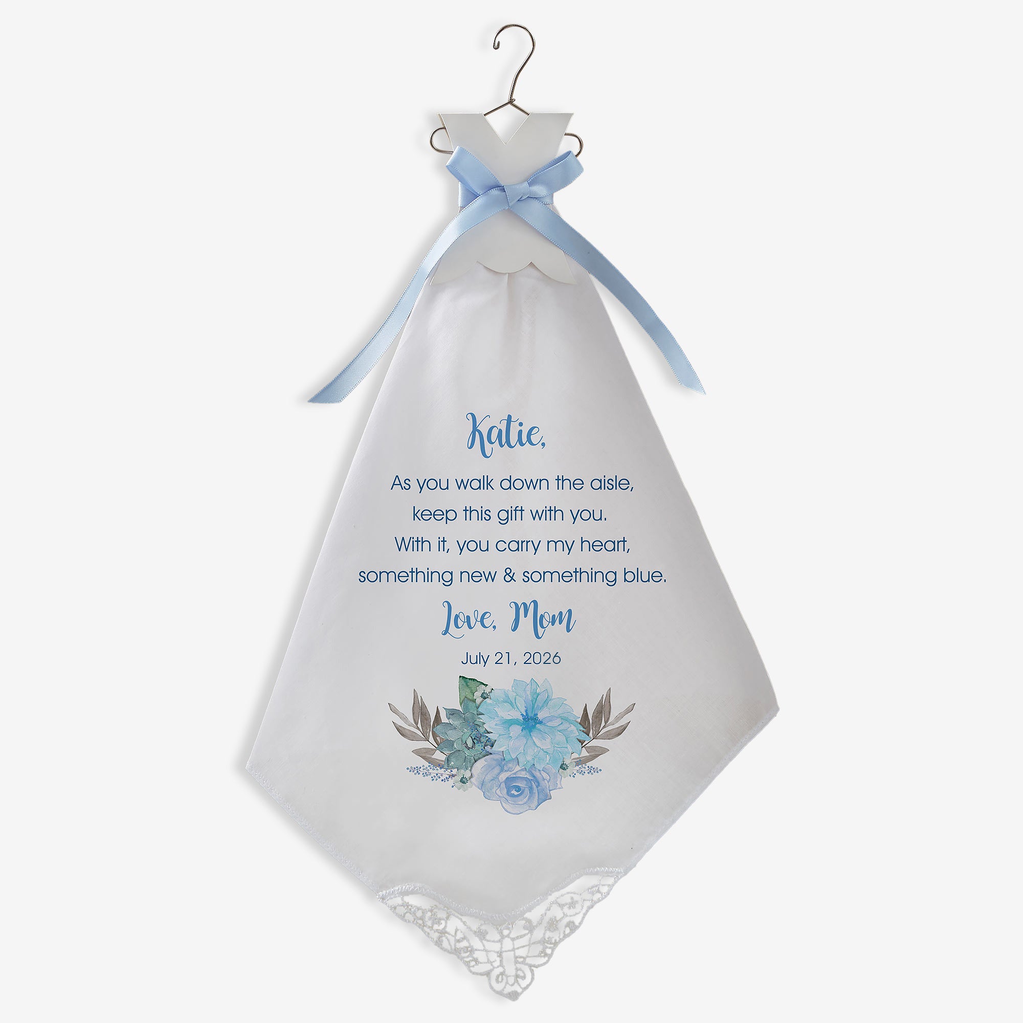 Our Bride's New & Blue Personalized Wedding Handkerchief is stylishly folded to resemble a darling wedding dress.