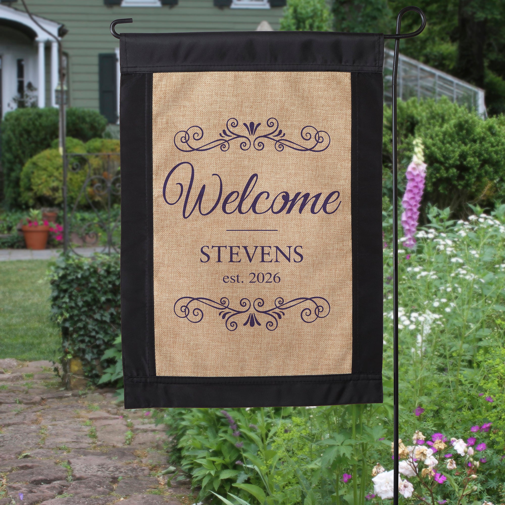 Add a unique, distinctive finish to your front yard or garden with our Welcome Personalized Burlap Garden Flag!
