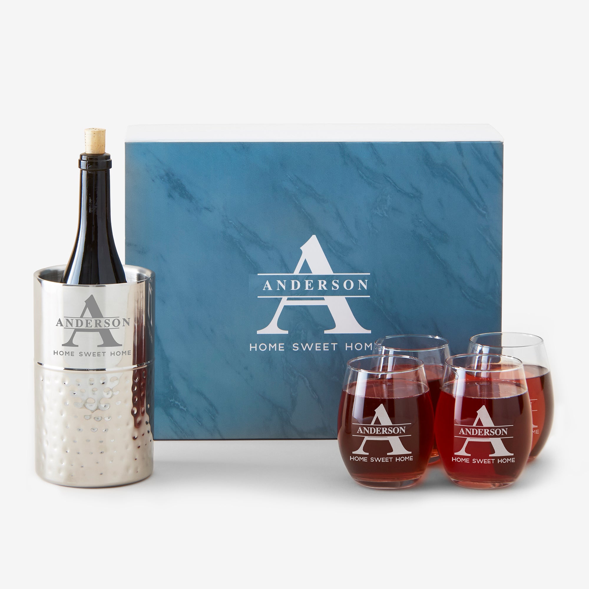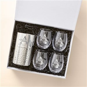 Introducing our elegant Lavish Last Name Personalized Wine Gift Set, the perfect choice for wine lovers and connoisseurs alike.This luxurious set features a hand-hammered wine chiller & four stemless wine glasses packaged together in a custom keepsake box.