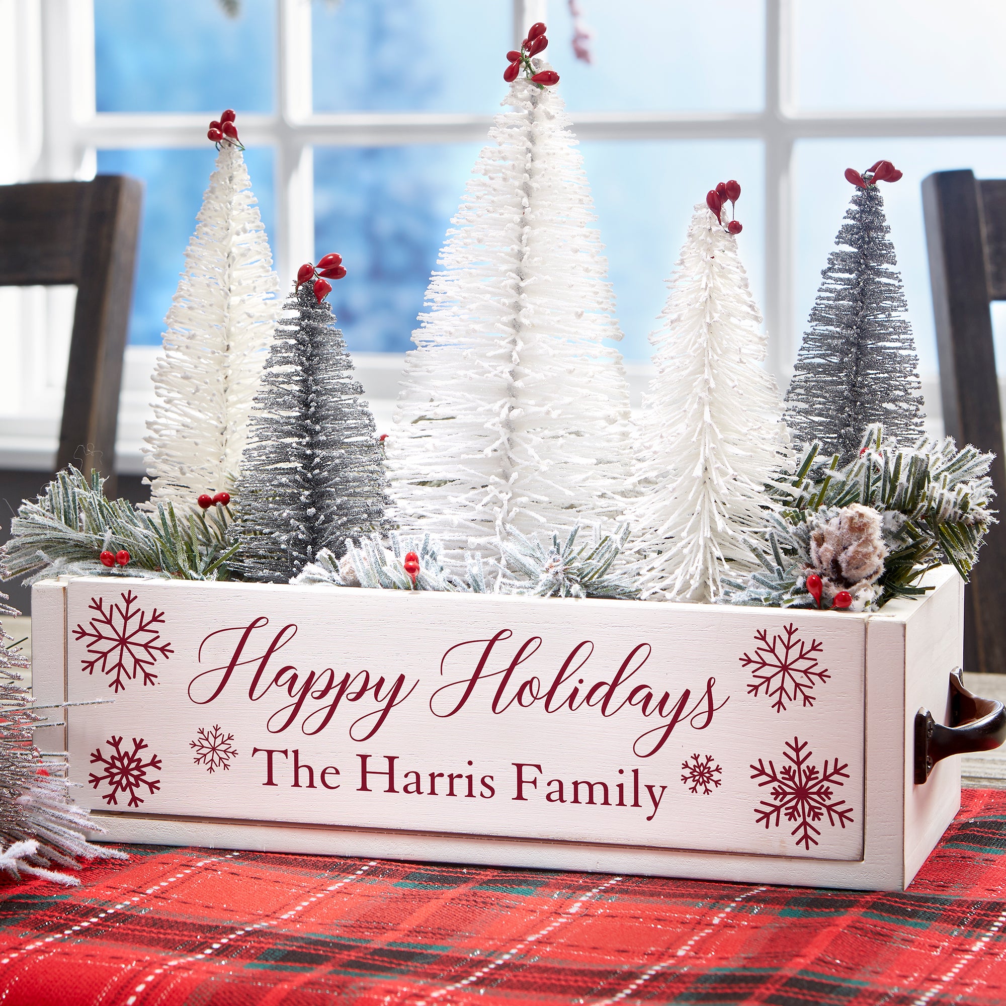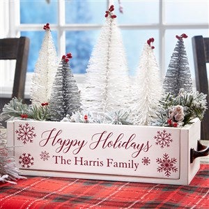 Add a decorative, farmhouse-inspired centerpiece to any table with the Winter Wonderland Personalized Wood Centerpiece Box. Fill with your favorite holiday accents, mason jars, ornaments, or even use as storage.