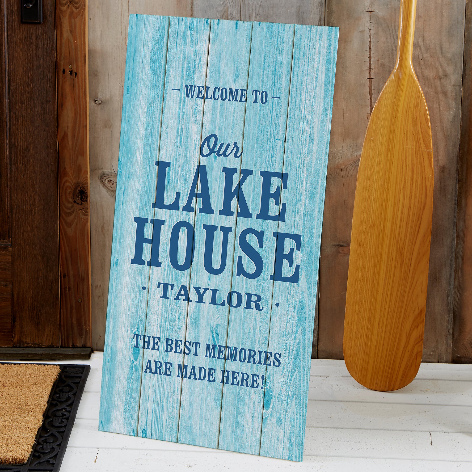 Decorate your vacation home or covered porch area in rustic charm with our Home Away From Home Personalized Standing Wood Sign.