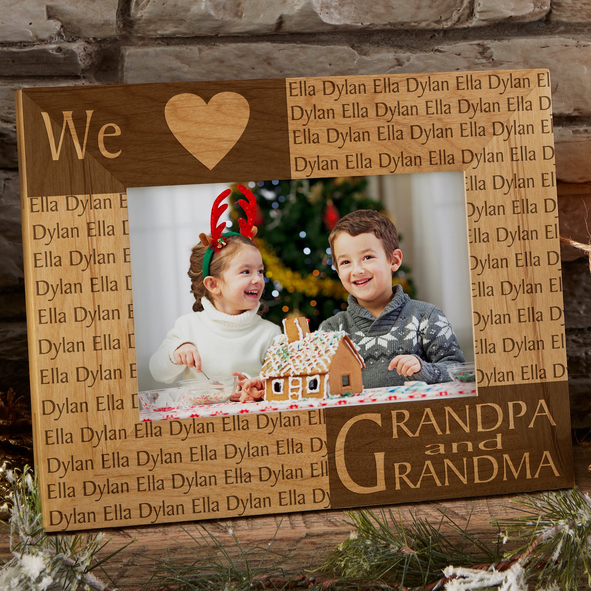 We skillfully engrave the I or We heart design with any name or title you choose. Then complete the personalization with first name(s) of each child, grandchild, etc. in our exclusive, unique repeat pattern throughout the entire frame face.