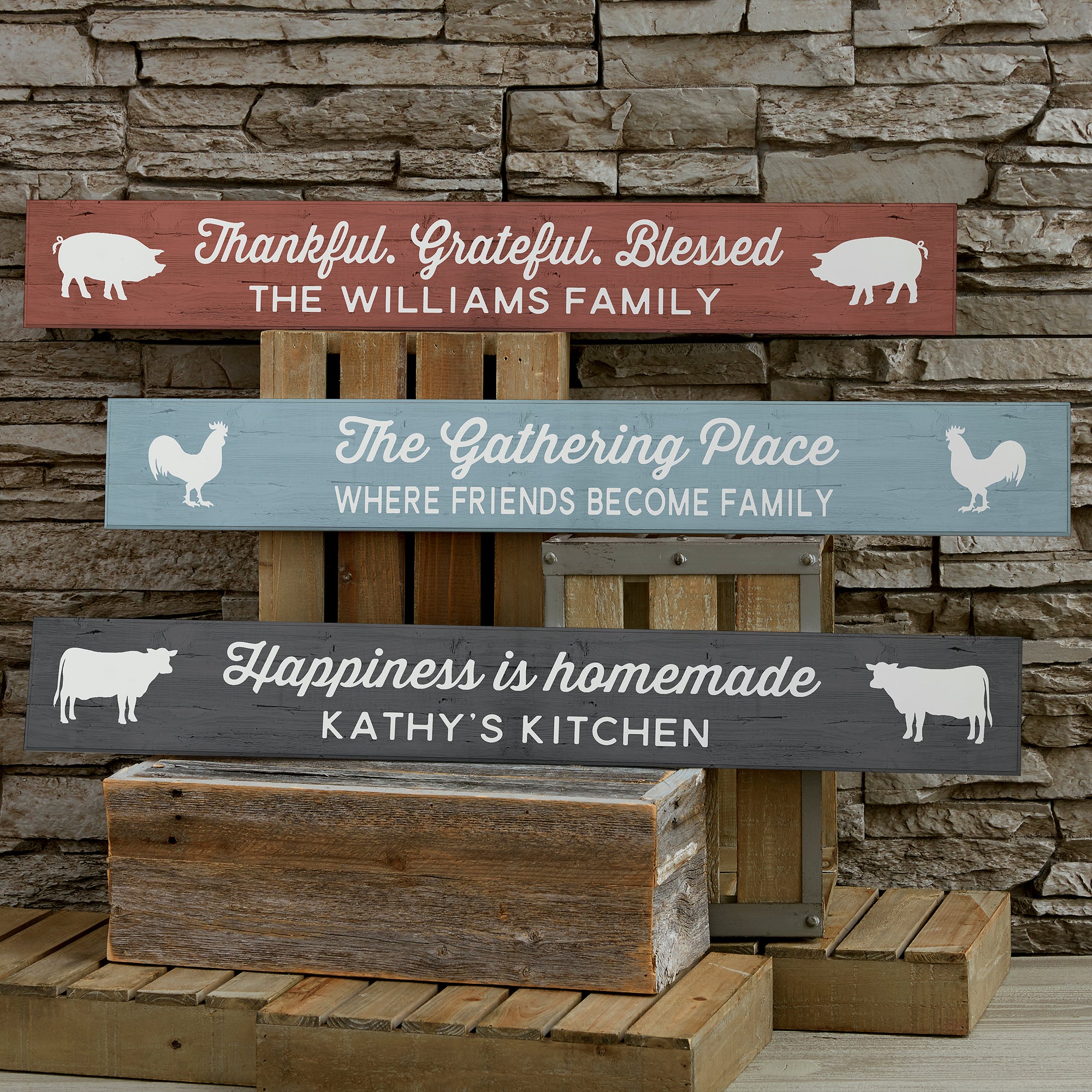We artfully print the signs with one of 3 farmhouse animal graphics in your choice of 5 color backgrounds. Personalize it with 2 lines of text in between the graphics.