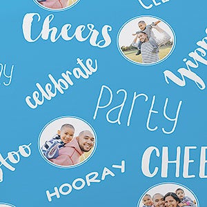 - Personalize with any six photos to be repeated amongst the celebratory phrases printed on pre-folded sheets