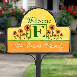 - Personalize with any single initial and family name within the bright sunflower design