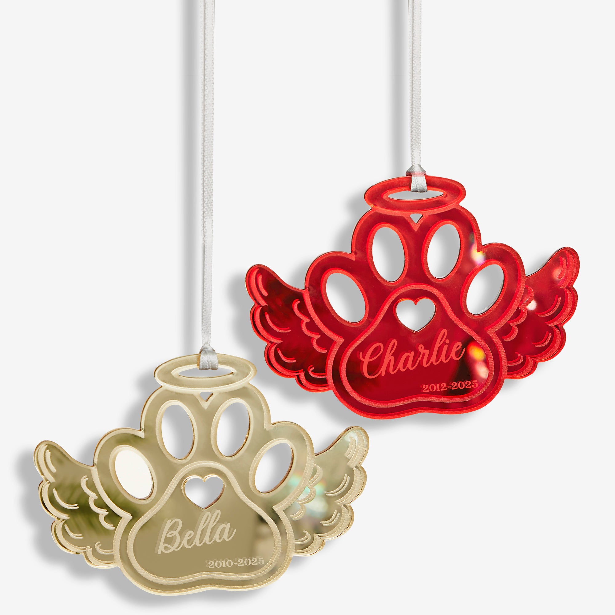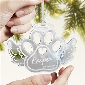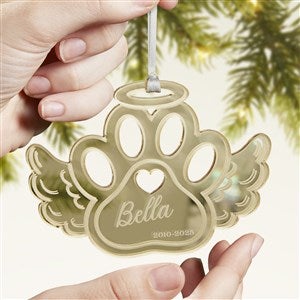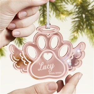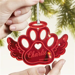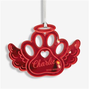 Celebrate the life of your furry friend this Holiday season with the Pet Memorial Personalized Acrylic Ornament! The pawprint wing is a cutout of a mirrored acrylic creating a beautiful reflection to hang on any holiday tree.