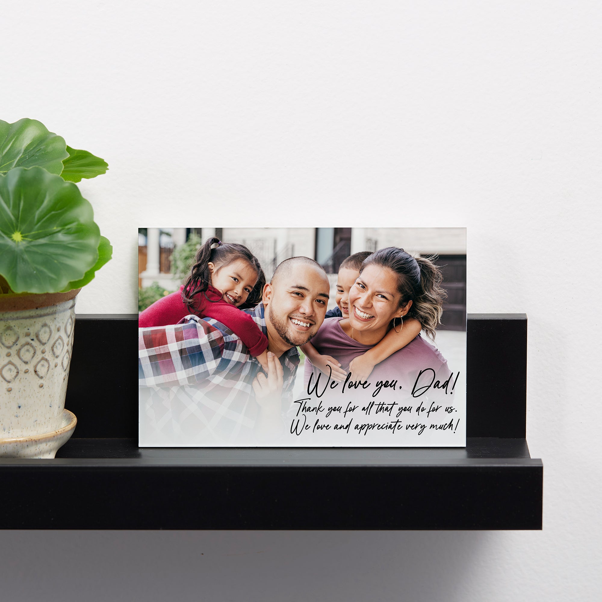 Display your favorite moments with our Photo Expression For Him Personalized Glass Photo Prints. Your photos are captured in vivid color inside frameless glass with a hard board backing for hanging or lean on a shelf for display. Pair multiple sizes together to create a stunning display of personalized home décor.