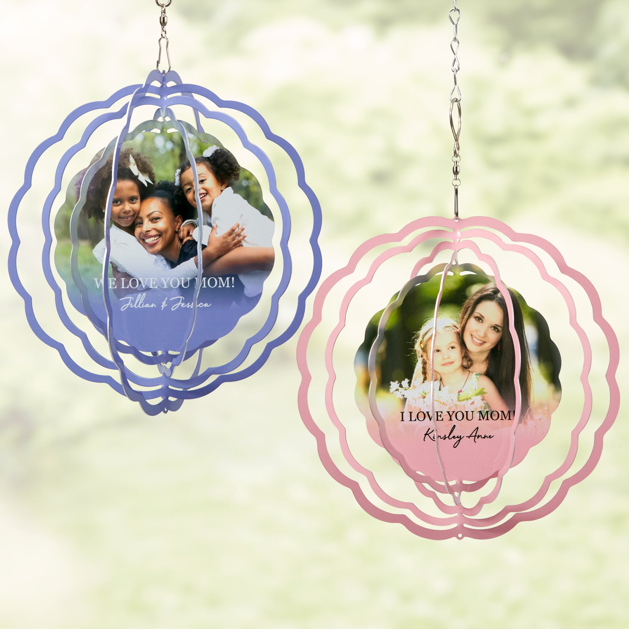 The Photo & Message For Her Personalized Wind Spinner opens up into a beautiful piece of art that moves and spins in the wind. Hang outside in the garden or off of a porch and enjoy your photos as they catch the wind.