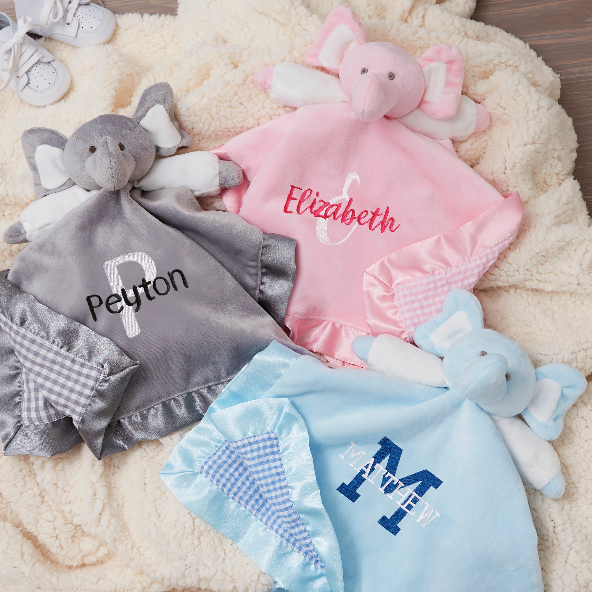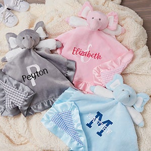 Incredibly soft and cuddly to the touch our Playful Name Personalized Elephant Baby Blankies are a popular choice as these security blankets are perfectly sized for baby to cuddle. This personalized security blanket makes a very cute gift to welcome a special baby boy or girl!