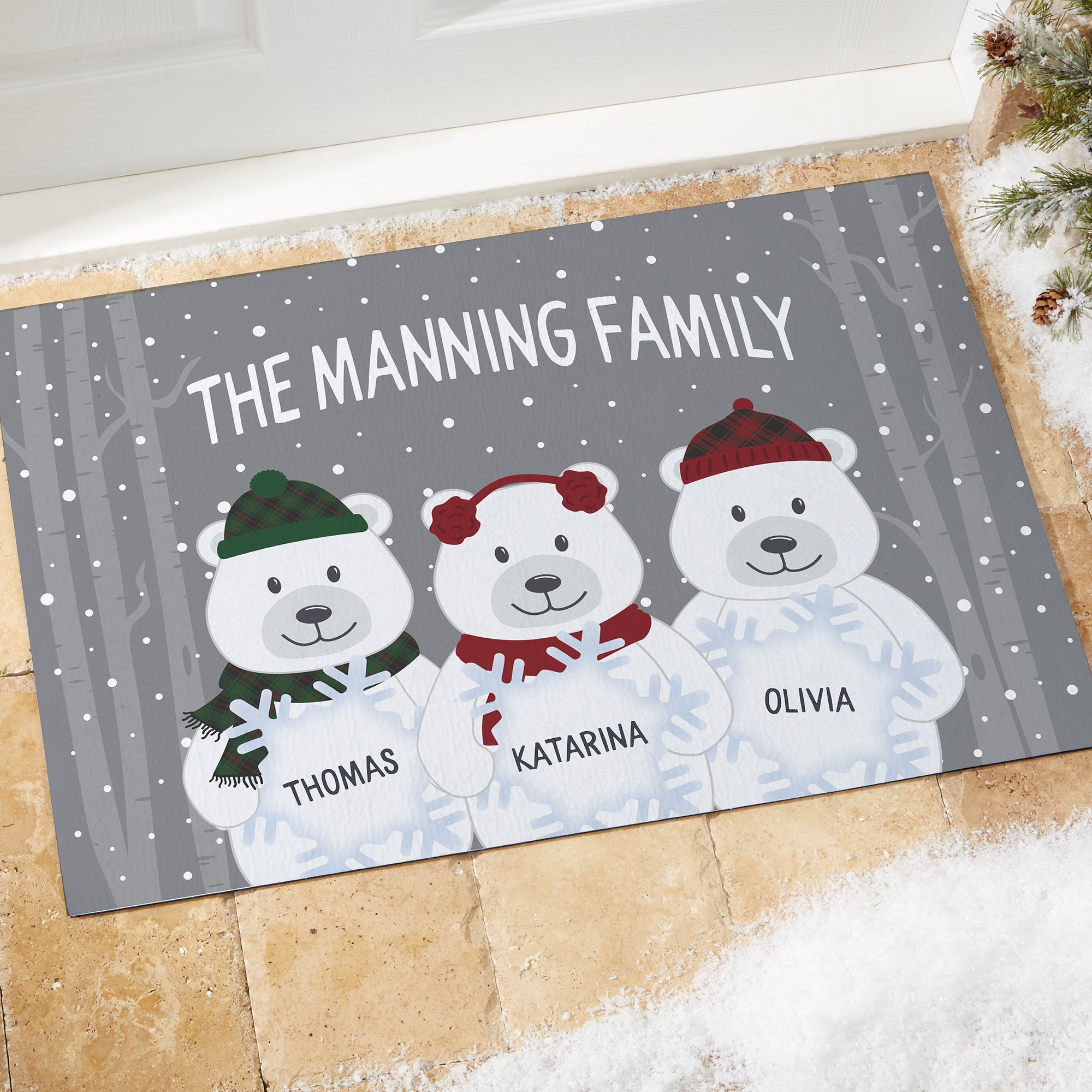 Give friends and family a festive, warm welcome this holiday season with our Polar Bear Family Personalized Christmas Doormats.