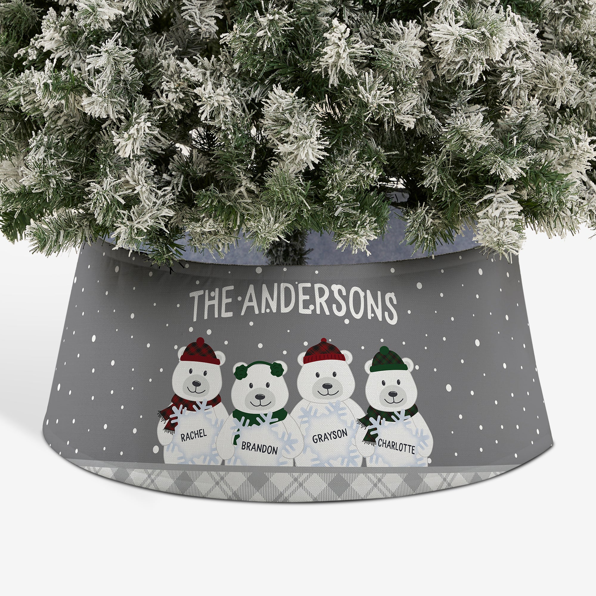 Add the perfect finishing touch to your tree this year with our Polar Bear Family Personalized Christmas Tree Collar. A cute and festive design keeps your tree stand neatly under wraps, creating a perfect backdrop for any gifts.