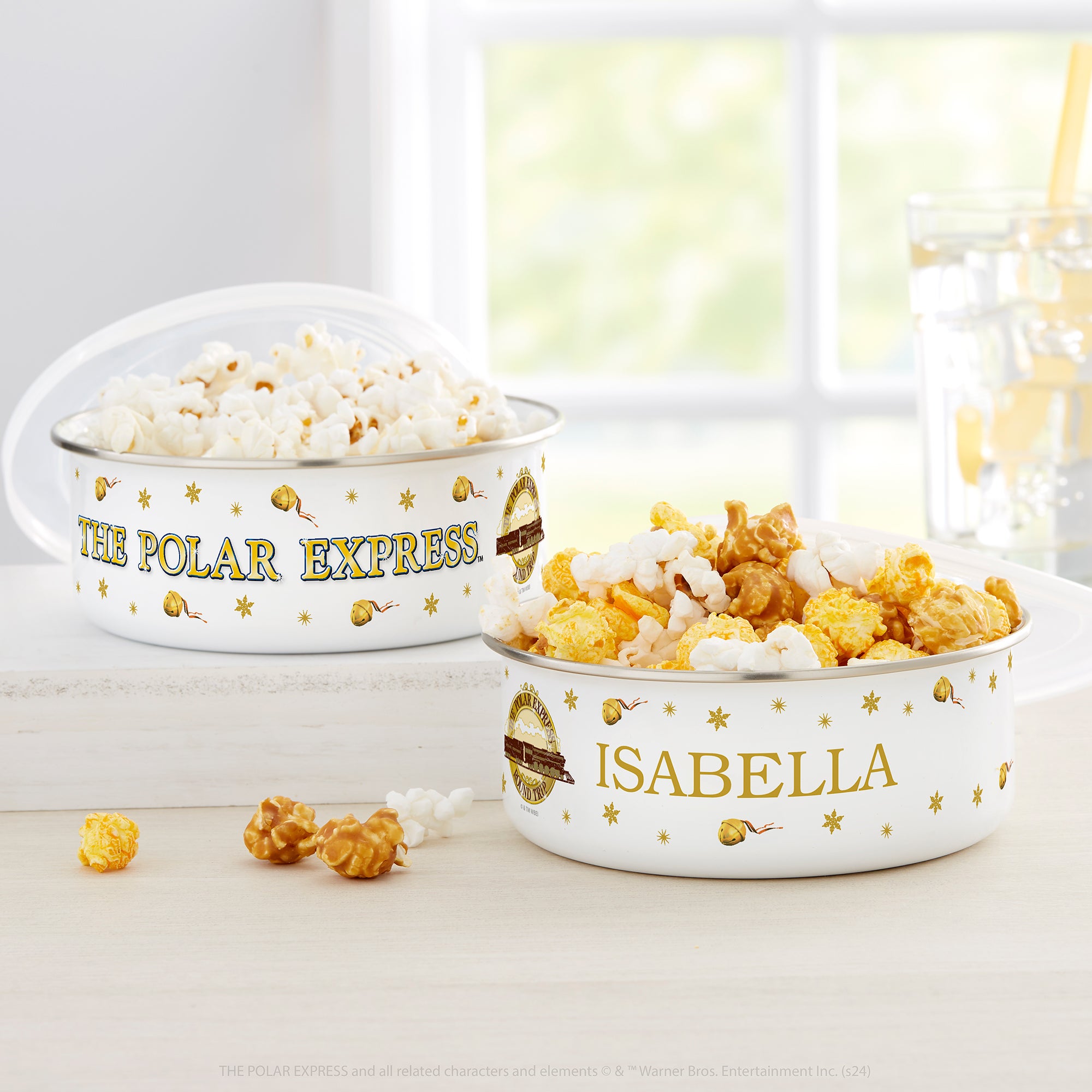 Keep your holiday treats safe and secure with Polar Express® Personalized Enamel Bowl with Lid. Featuring any name, this bowl is perfect for filling with holiday snacks.