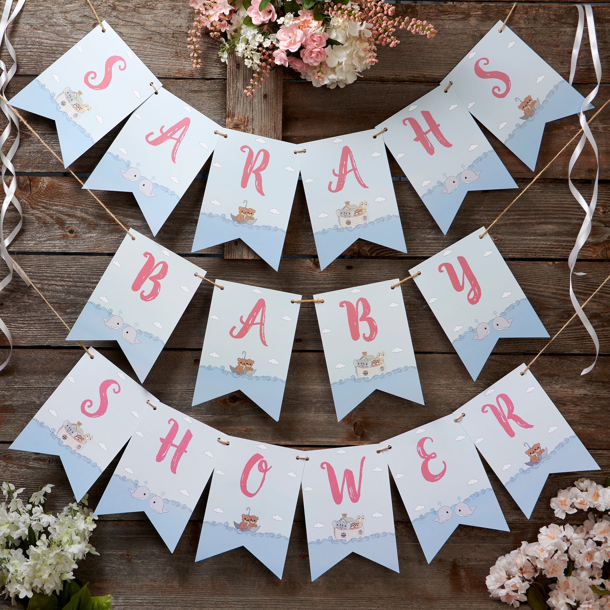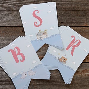 Celebrate the mom to be in an adorable Noah's Ark theme with the Precious Moments® Noah's Ark Personalized Bunting Banner, the perfect decoration for any baby shower.