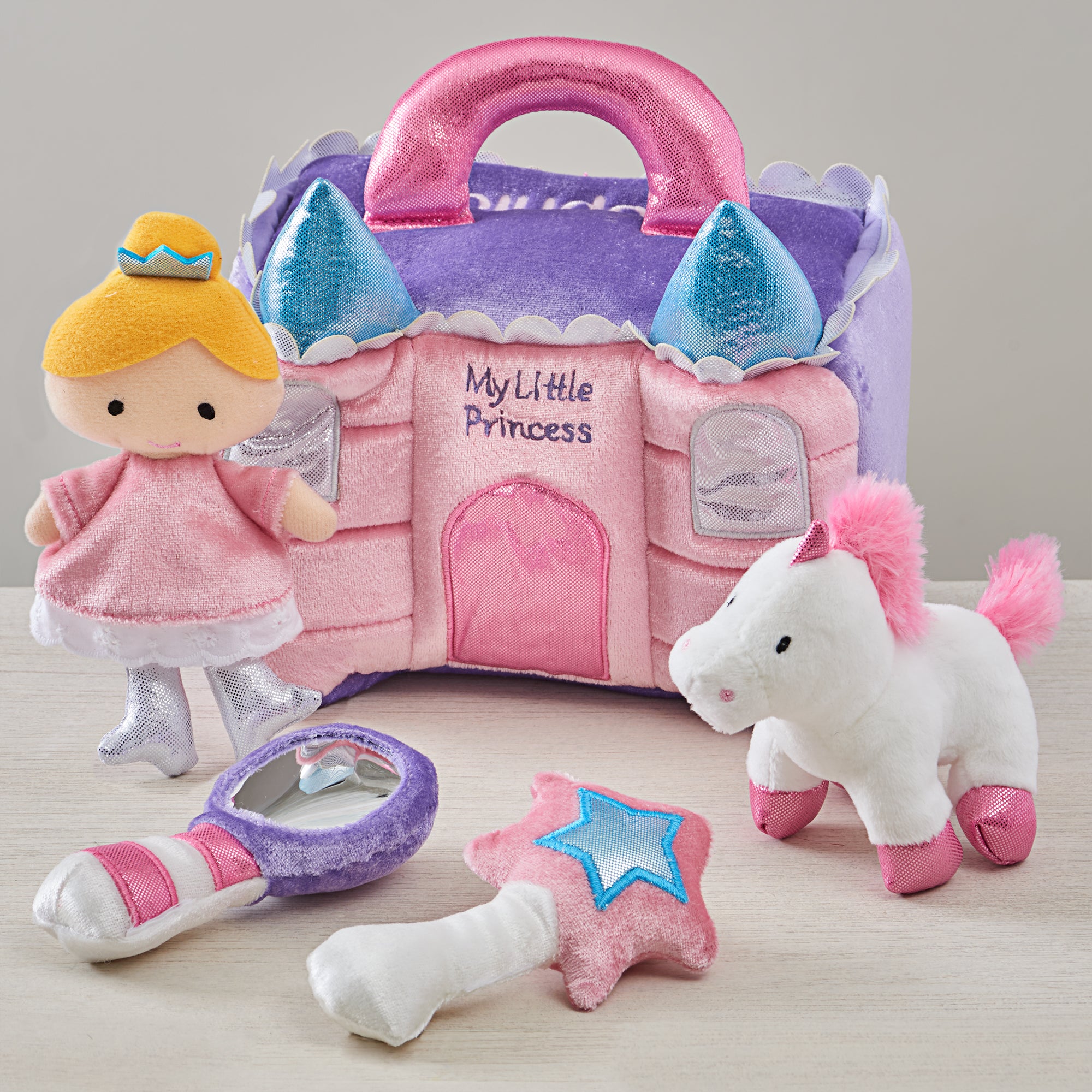 Your own little princess will love playing with our Princess Castle Personalized Playset by Baby Gund® . Our adorable and colorful touch and close playset includes a princess castle and 4 toys.